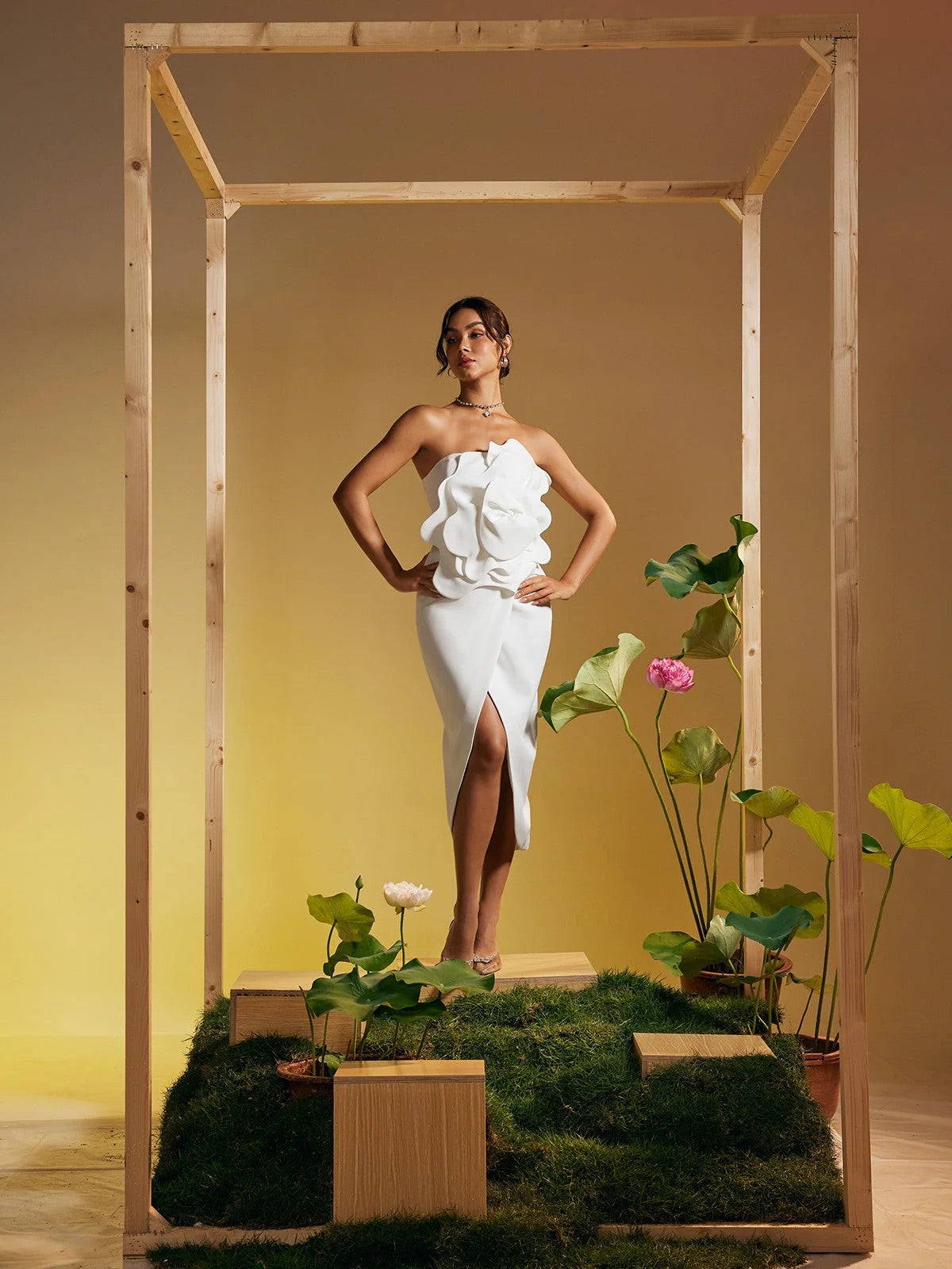 Get ready to turn heads in this stunning dress! The strapless design and floral print make for a feminine and flirty look, while the midi length and split detail add sophistication. Perfect for a formal occasions or special event, this dress will make you feel confident and beautiful.
