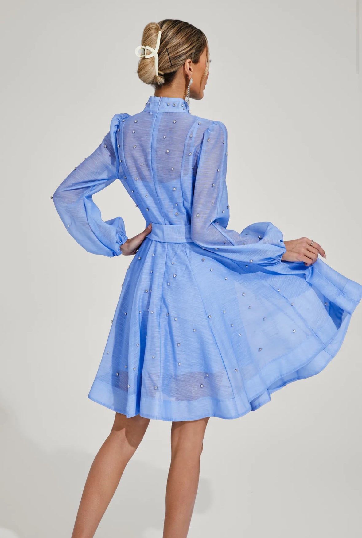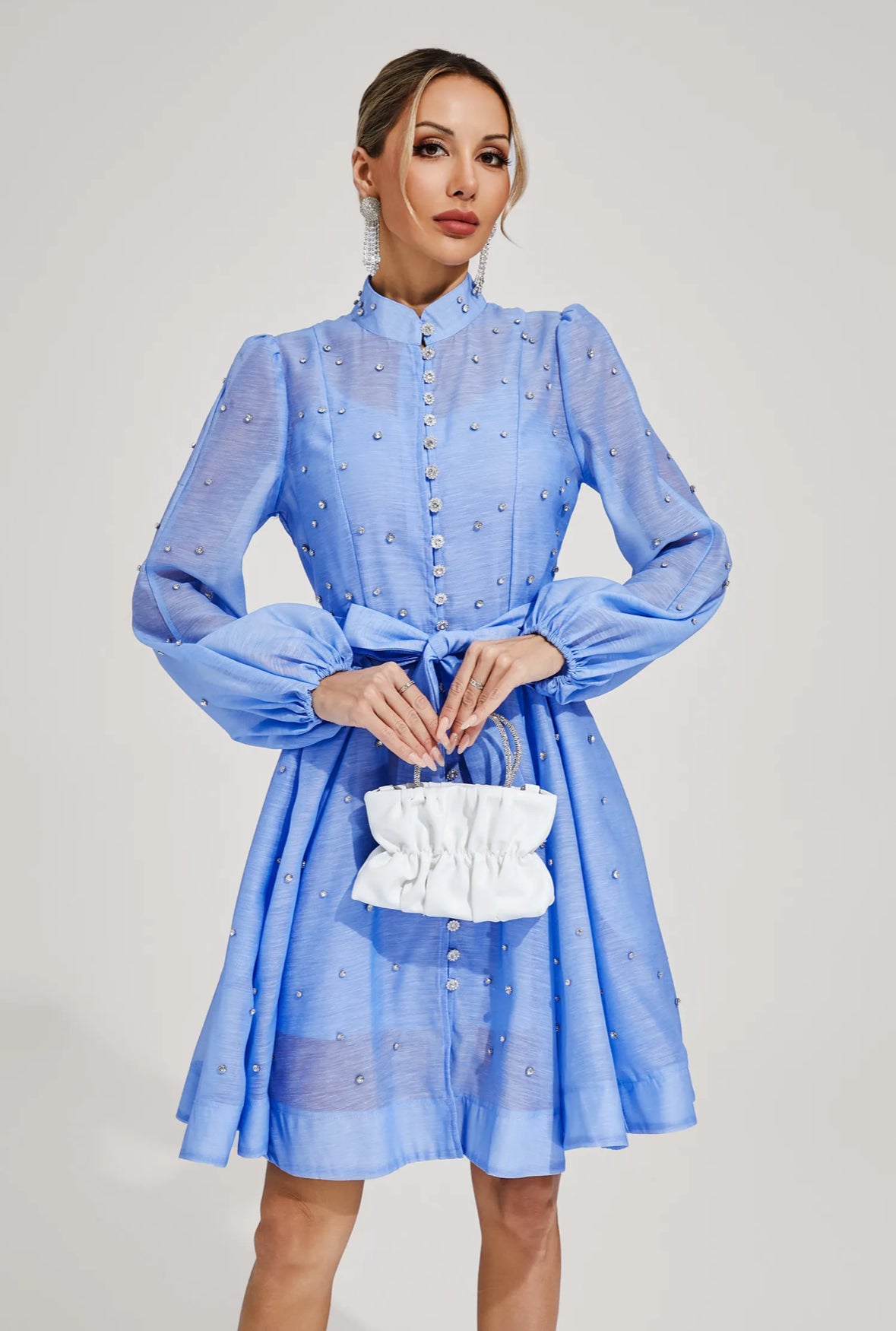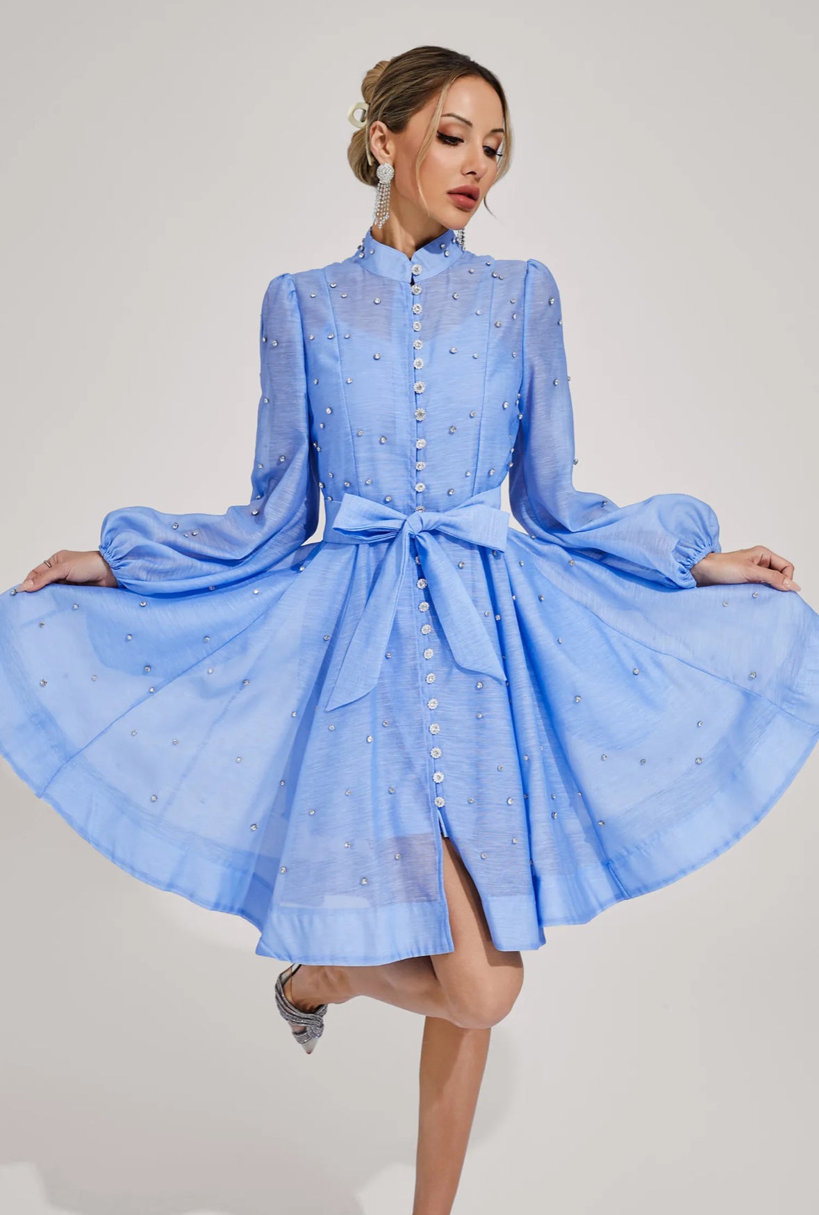 Design Details: High-neck mini dress featuring a full button-down front, pearl stud embellishments, sheer balloon sleeves with cuffs, and a matching waist belt for a cinched silhouette. Fully lined for coverage.