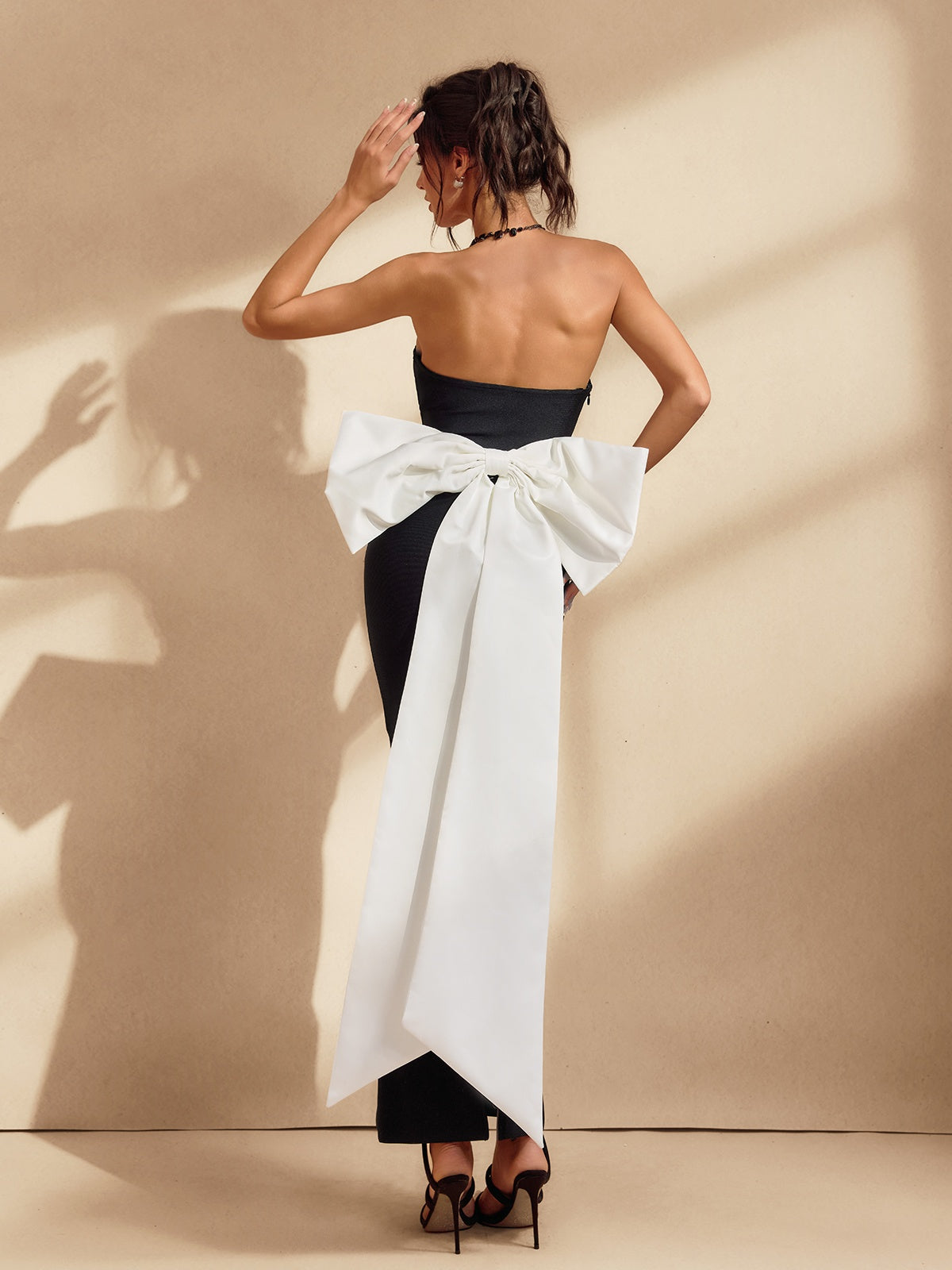Pair with black or crystal heels and minimalist jewelry to keep the attention on the statement bow. A sleek updo or soft waves will elevate the neckline and back detail.