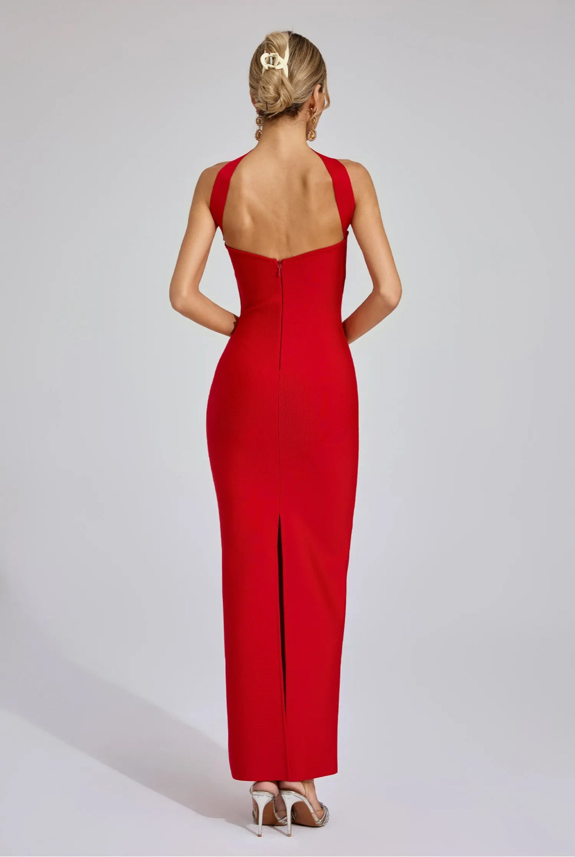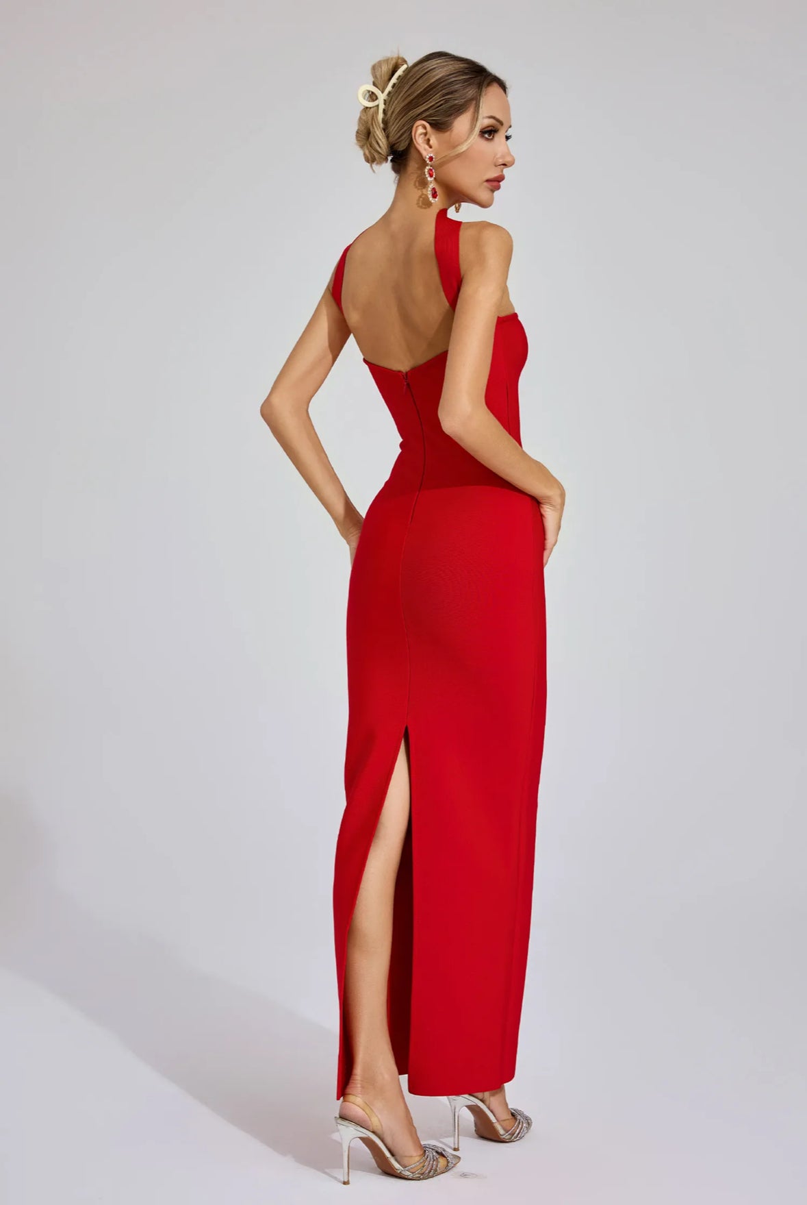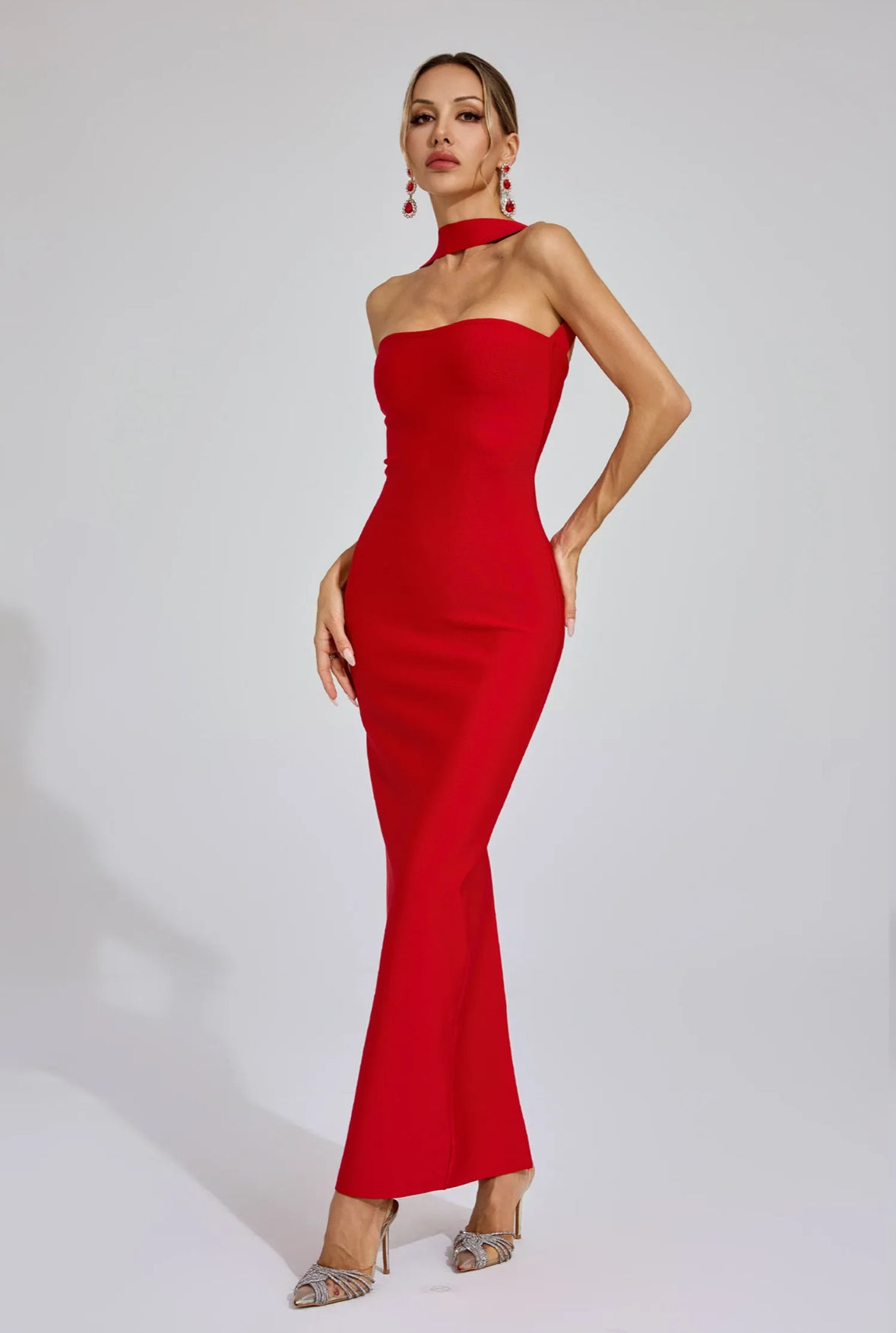 This striking gown features a clean strapless silhouette with a sharp neckline and a sleek body-hugging fit that elongates the frame. A matching attached neckband adds sophistication, while wide shoulder straps continue into a subtly curved open back. The ankle-length hem and back slit allow effortless movement with grace.