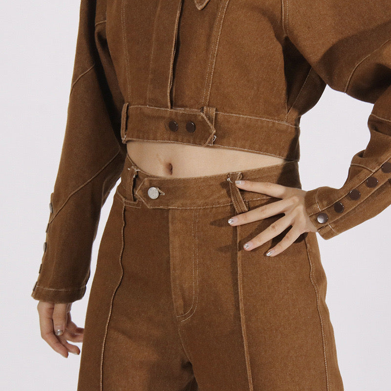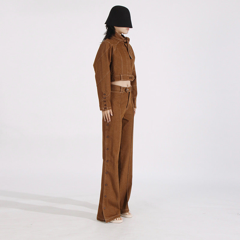 Step into style with our Brown Denim Side Button Set! These quirky pants feature a unique side button design, adding a playful twist to your wardrobe. Made from high-quality brown denim, you'll stay comfortable and fashionable all day long.