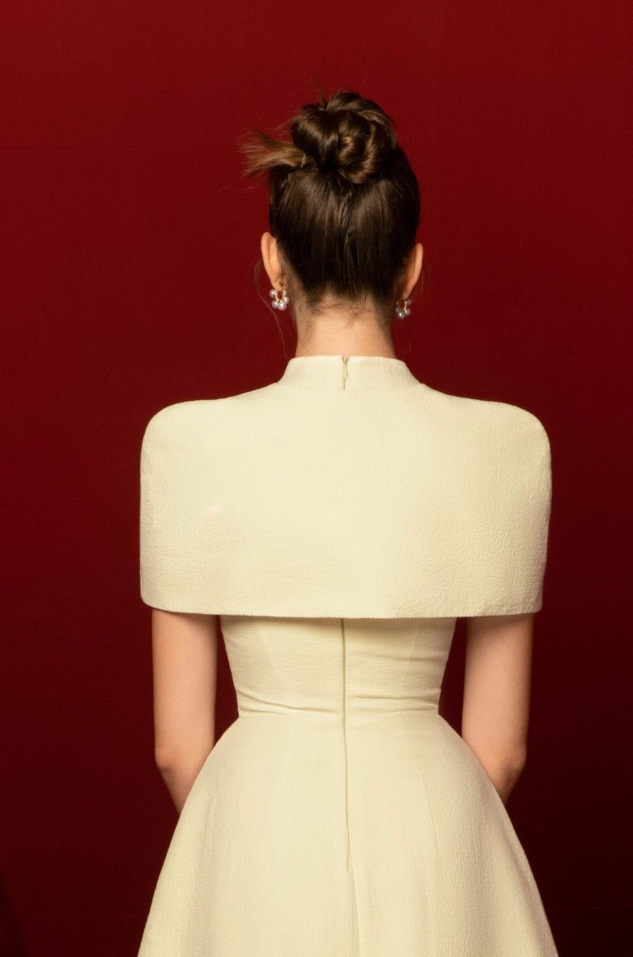 - Convertible design: includes a detachable cape-style shoulder overlay with covered buttons