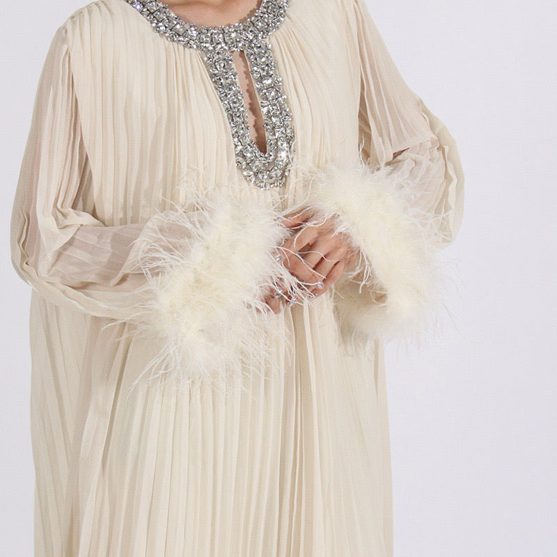 Shine & soar in this dazzling purple maxi dress. Adorned with crystal neckline and feathers, it's the perfect blend of sparkle & whimsy. Show off your unique style and turn heads with this dress.