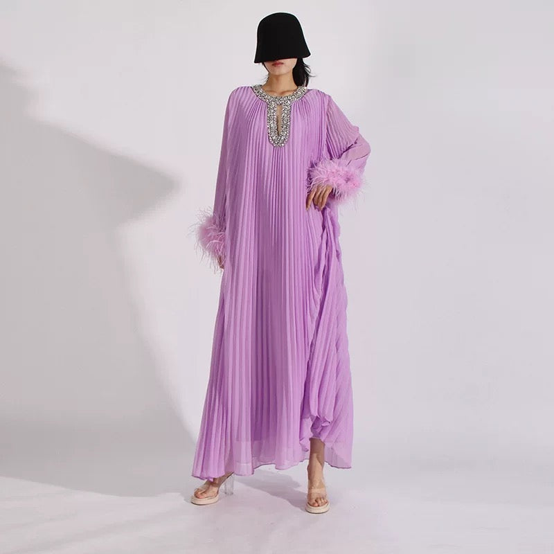 Shine & soar in this dazzling purple maxi dress. Adorned with crystal neckline and feathers, it's the perfect blend of sparkle & whimsy. Show off your unique style and turn heads with this dress.