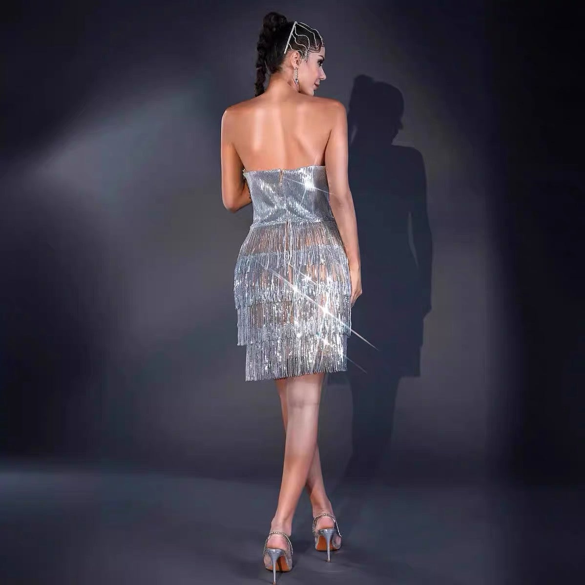 Step out in style with our Crystal Fringe Mini Dress. Featuring intricately placed crystals and an elegant fringe design, this strapless dress exudes luxury and is sure to turn heads. Perfect for any special occasion, show off your impeccable fashion sense with this stunning piece.