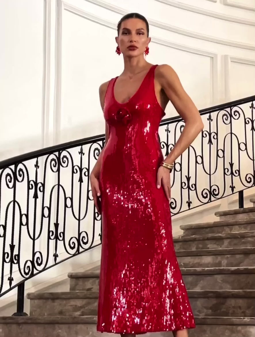 Embody elegance and confidence with the Plunge Neck Flower Sequin Dress in gold. This stunning dress features a plunging neckline, intricate flower sequin details, and a bold red color that will turn heads. Elevate your style and make a statement at any special occasion.