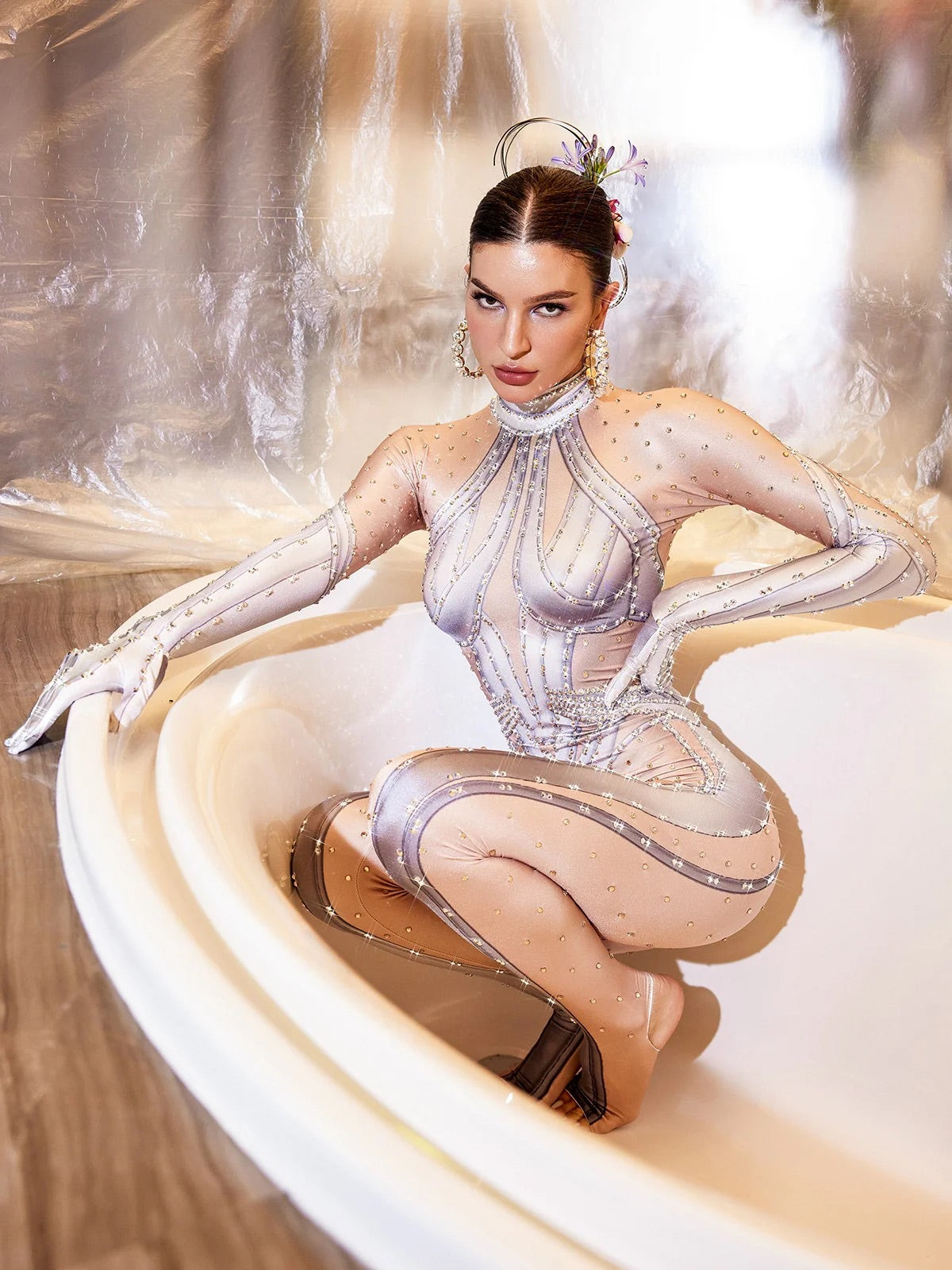 ラインストーン ボディ プリント グローブ ジャンプスーツは、高級感と洗練さを醸し出します。ラインストーンのディテールとプリント グローブが特徴のこのジャンプスーツは、ファッションに敏感な方なら必携のアイテムです。高級素材を使用したこのアイテムは、あなたのワードローブを新たな高みへと引き上げる真の芸術作品です。