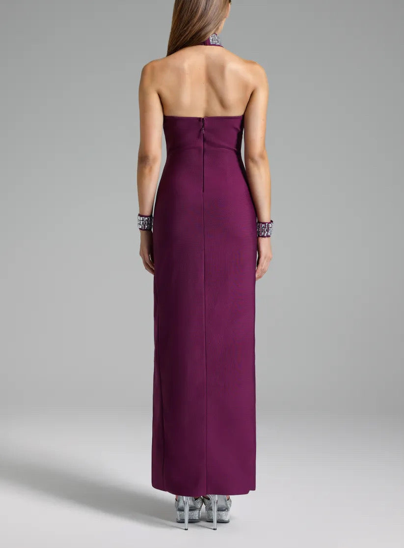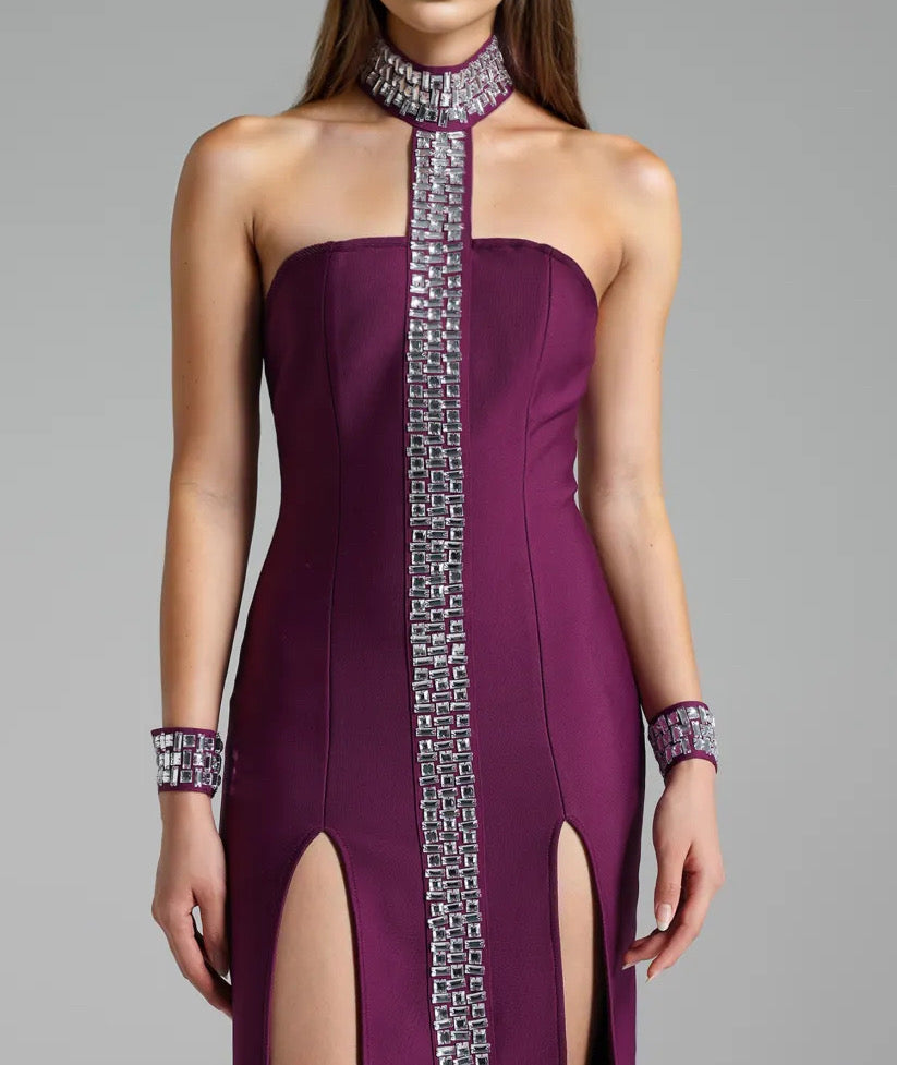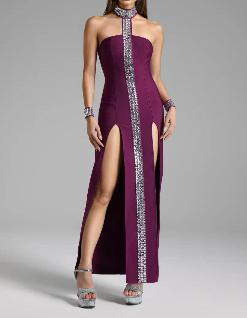 This show-stopping gown features a luxurious strapless silhouette with a double high-slit design for maximum drama. The centerpiece is a dazzling crystal-encrusted vertical trim that extends from the neck down the length of the front, creating the illusion of a glamorous built-in necklace and elongating the figure. The body-hugging construction emphasizes curves, while the back maintains a clean, elegant zip-up finish.