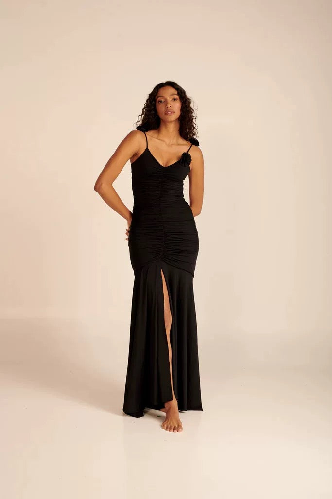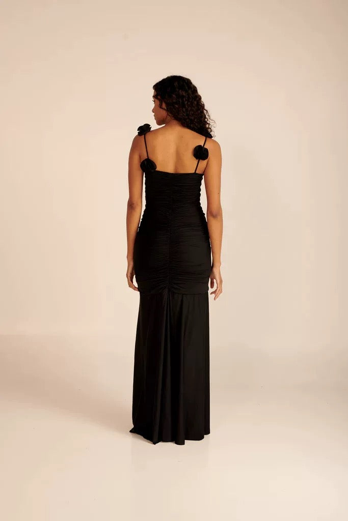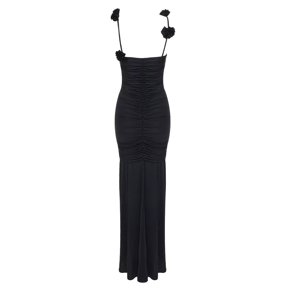Design Details: Elegant and feminine, this floor-length gown features delicate 3D flower appliqués on each shoulder strap, creating a romantic touch. The dress is fully ruched for a flattering contour effect, and it includes a dramatic front slit for ease of movement and a graceful silhouette.