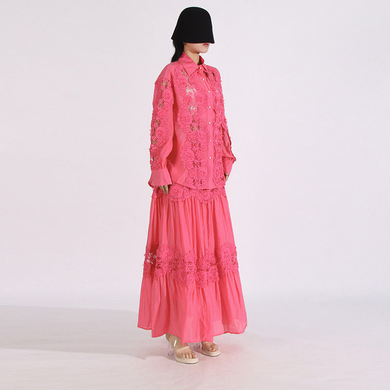 This elegant set features exquisite lace detailing and a maxi skirt for a timeless yet chic look. The shirt and skirt can be worn separately for versatile styling options. Make a sophisticated statement with this stunning lace detailed shirt & skirt set.