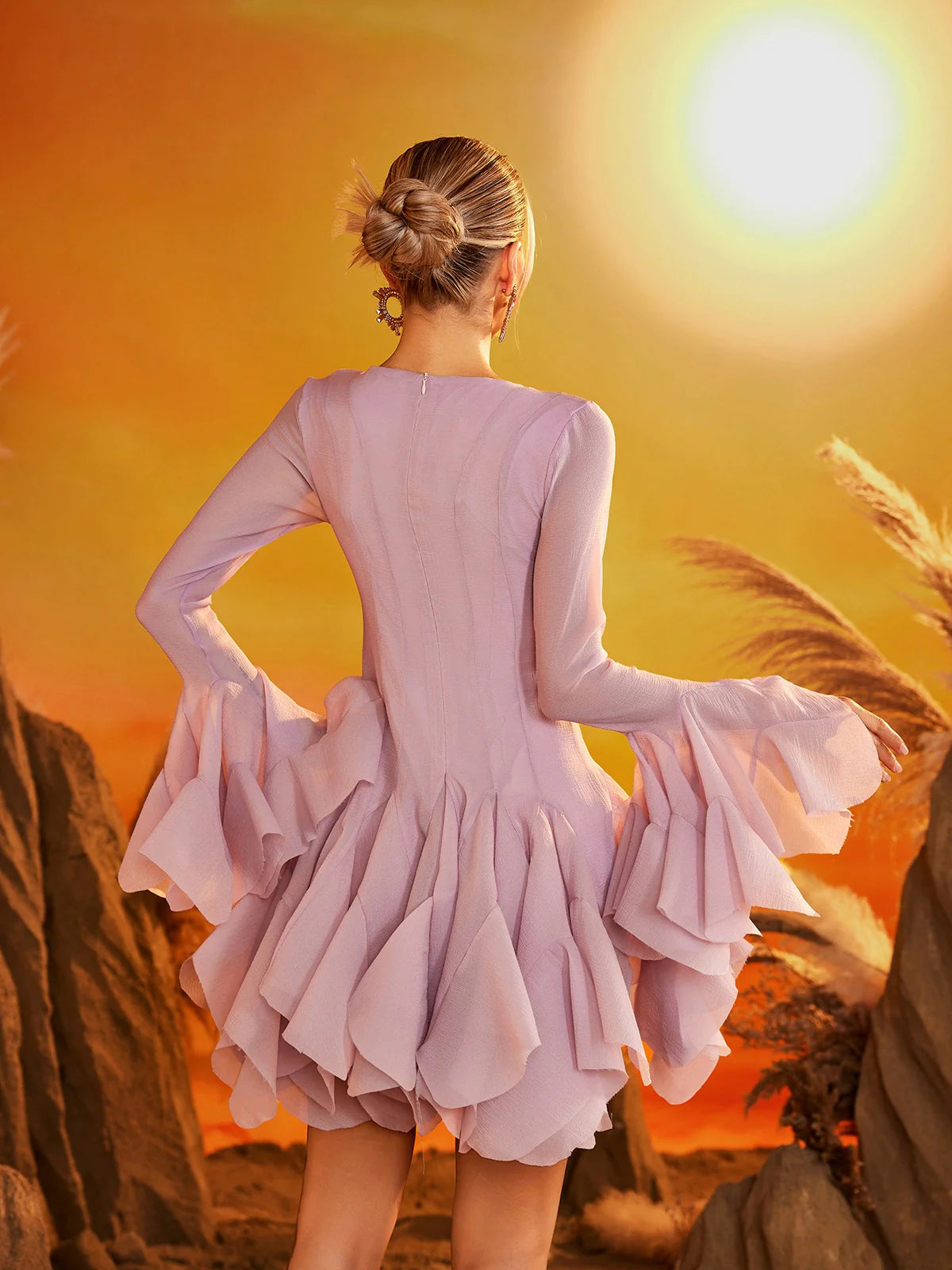 A playful yet romantic mini dress featuring a fitted bodice with delicate front buttons and exaggerated ruffled flare sleeves. The skirt is richly layered with cascading ruffles for dramatic movement, while the back maintains a clean silhouette. The fabric’s soft lavender tone adds a dreamy, feminine touch.