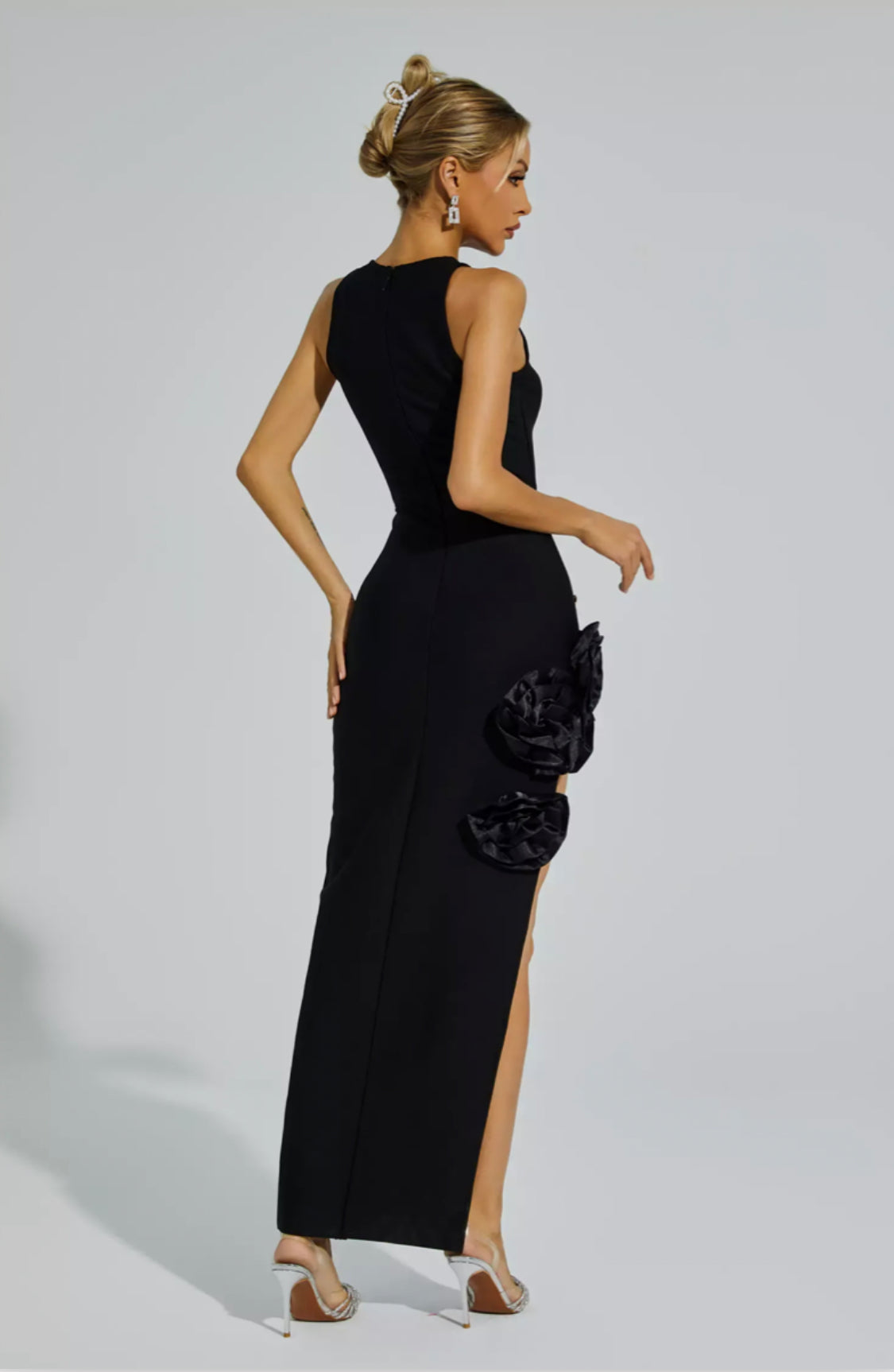 Crafted from high-quality bandage fabric, the Maya Black Rose Slit Bandage Dress exudes timeless elegance. Its pleated edges and a flattering slit revealing a hint of skin, while the golden embellishments add a touch of luxury. Perfect for any formal occasion, this long dress hugs the curves effortlessly, making it a must-have addition to any fashionable wardrobe.