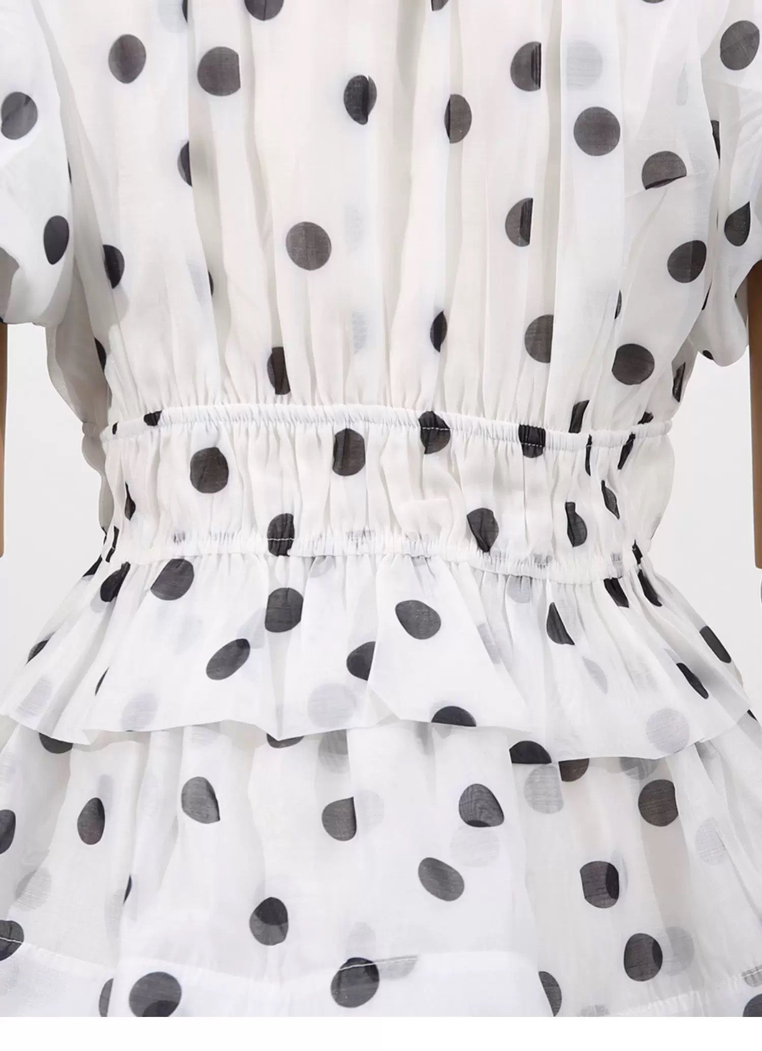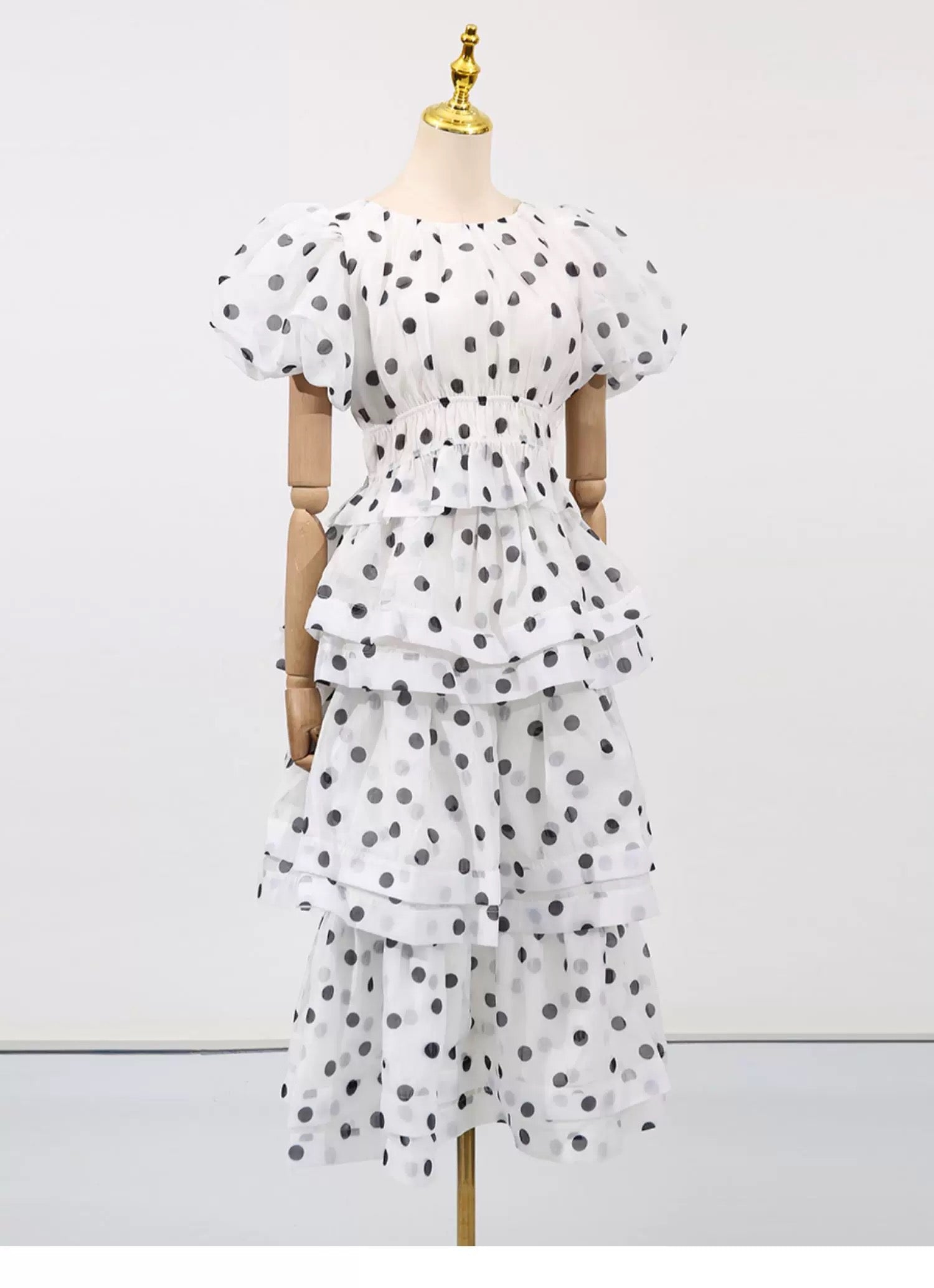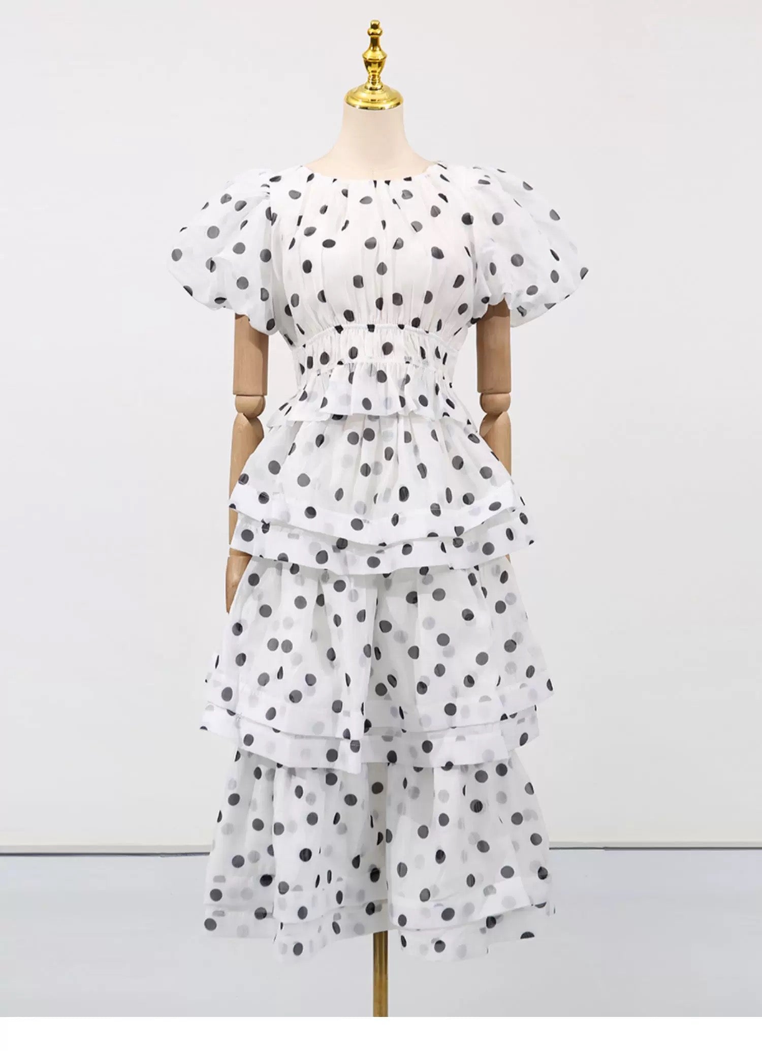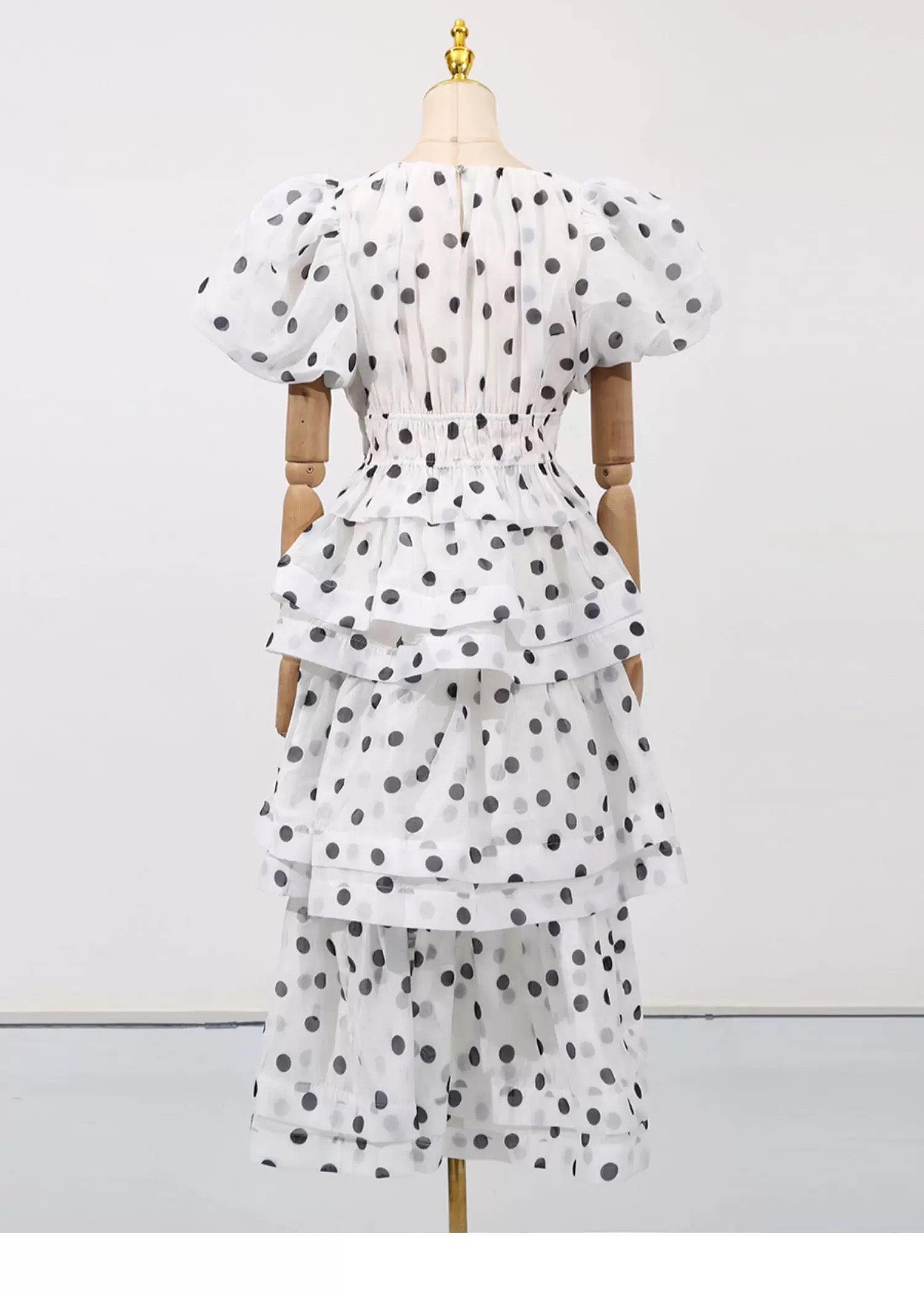 Playful meets polished in the Odette Tiered Dot Dress, a statement piece that balances volume and charm. Featuring puffed short sleeves and a gathered bodice with a cinched waist, the silhouette flows into dramatic tiered layers that cascade with effortless flair. The timeless ivory base is adorned with classic black polka dots, adding a touch of retro whimsy to this modern structured piece.