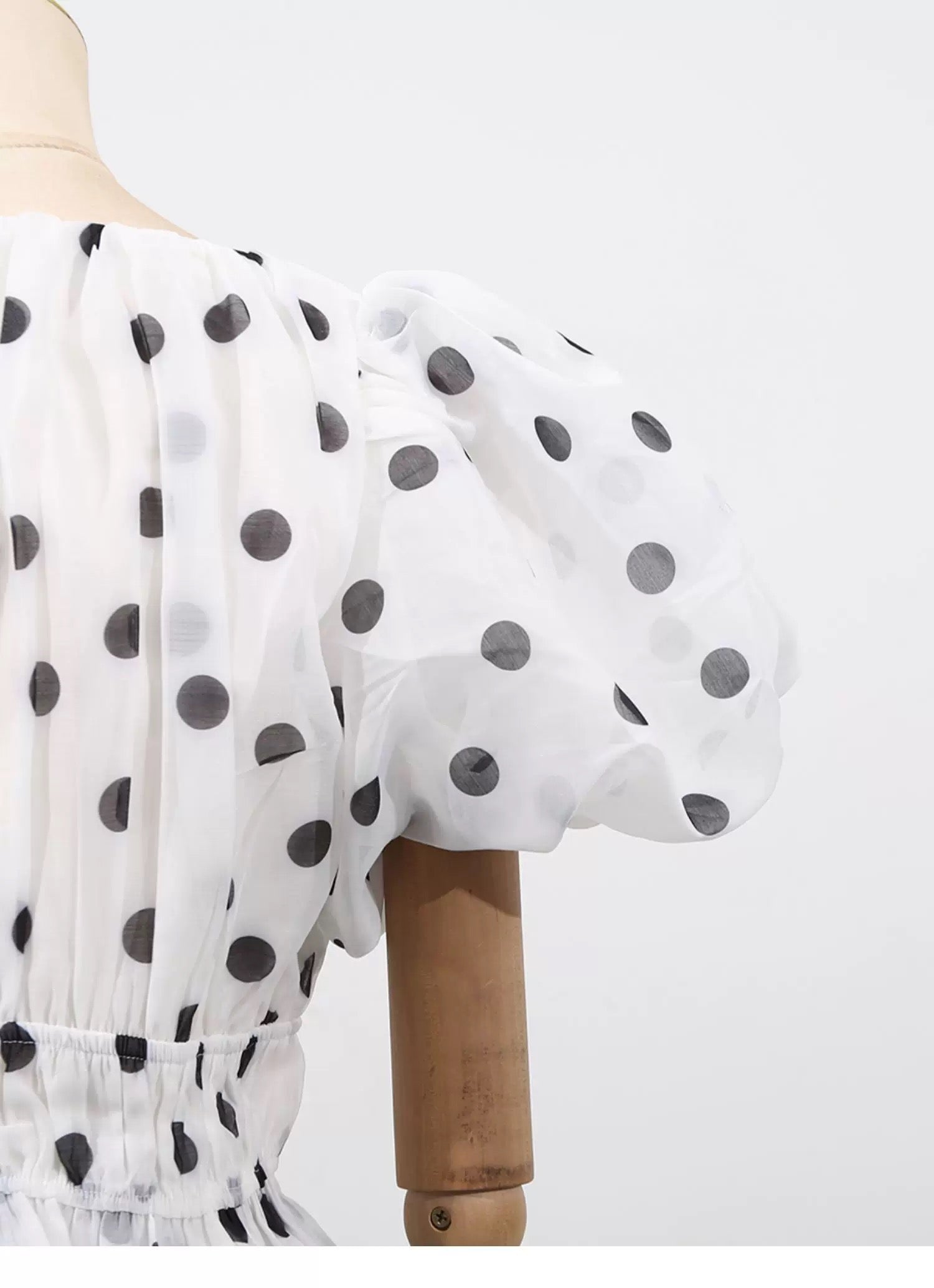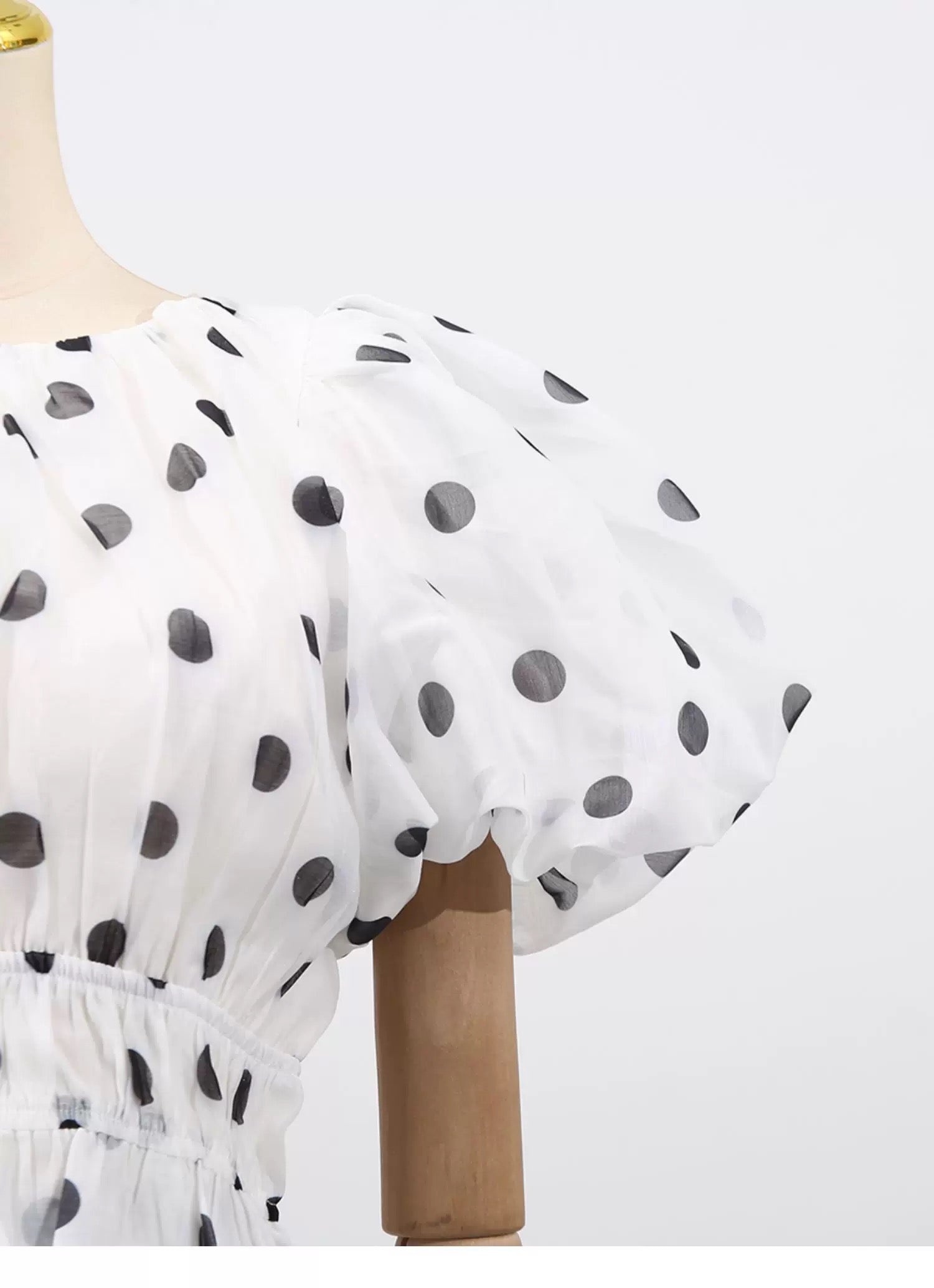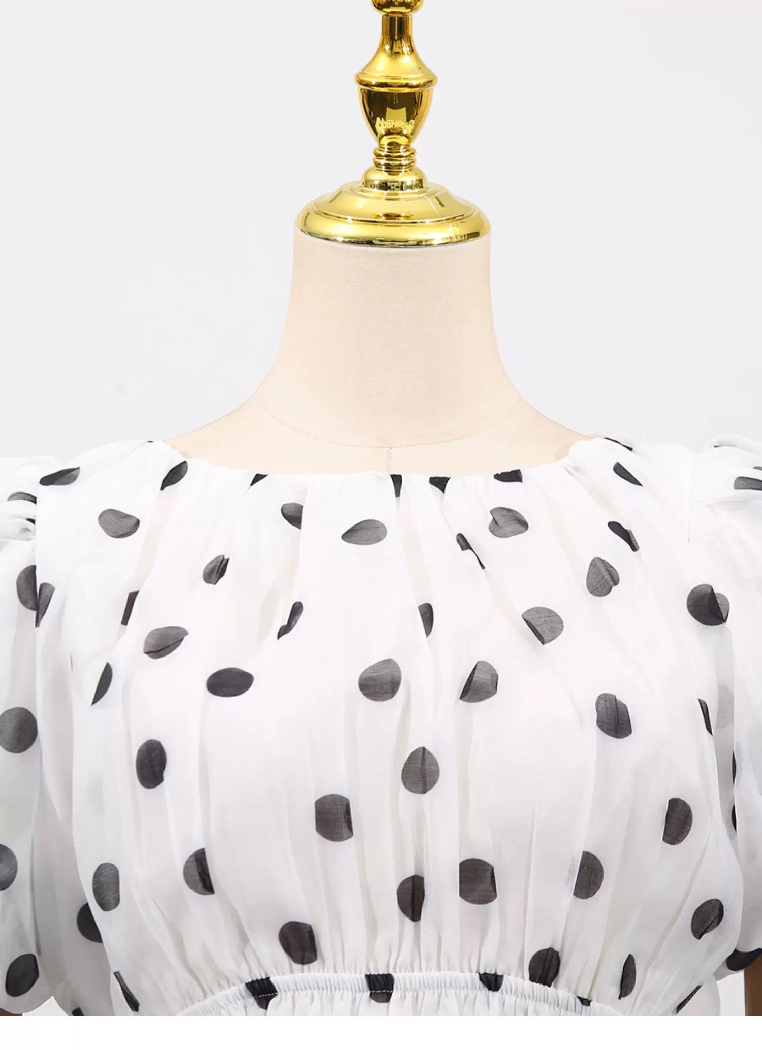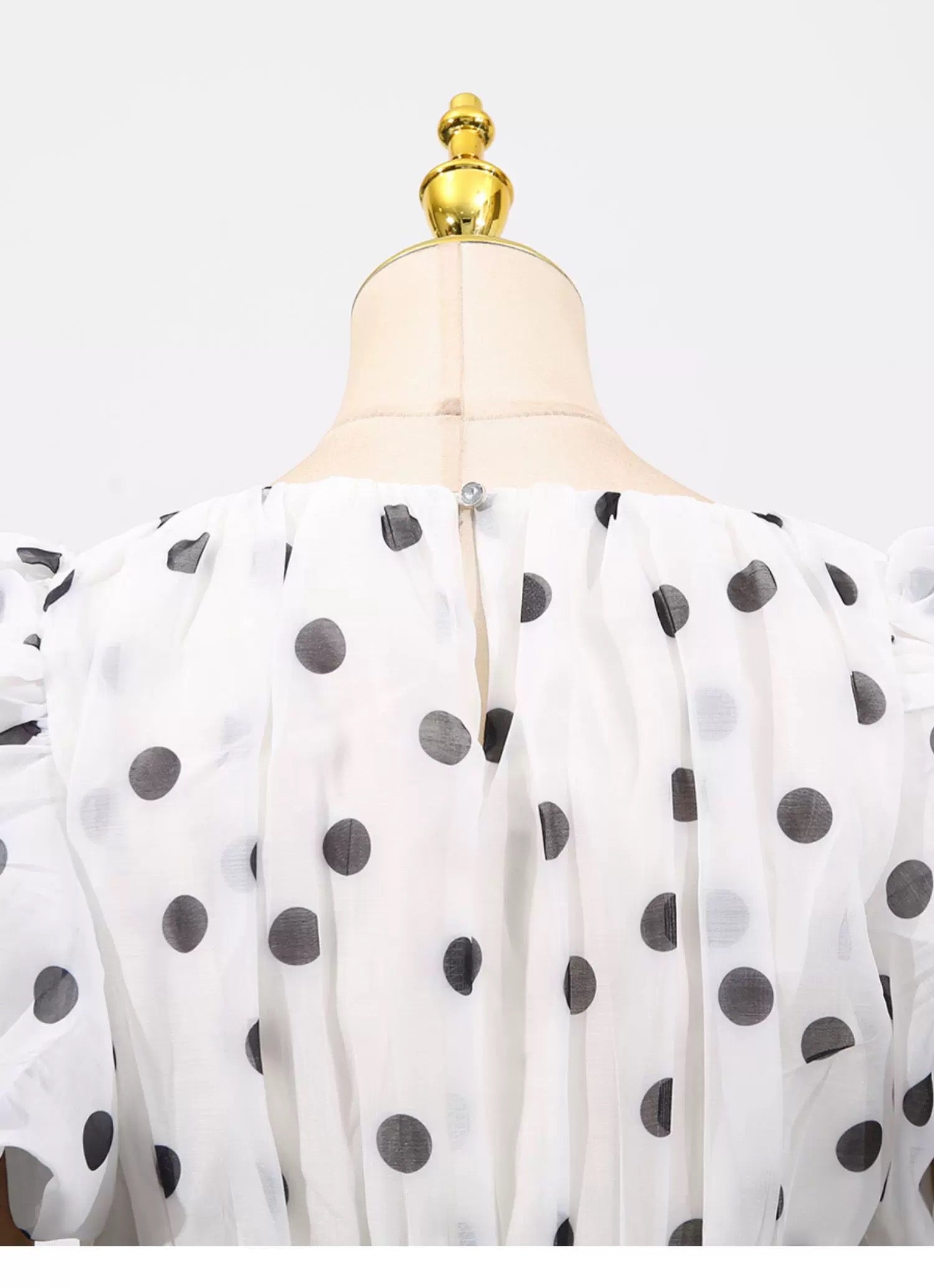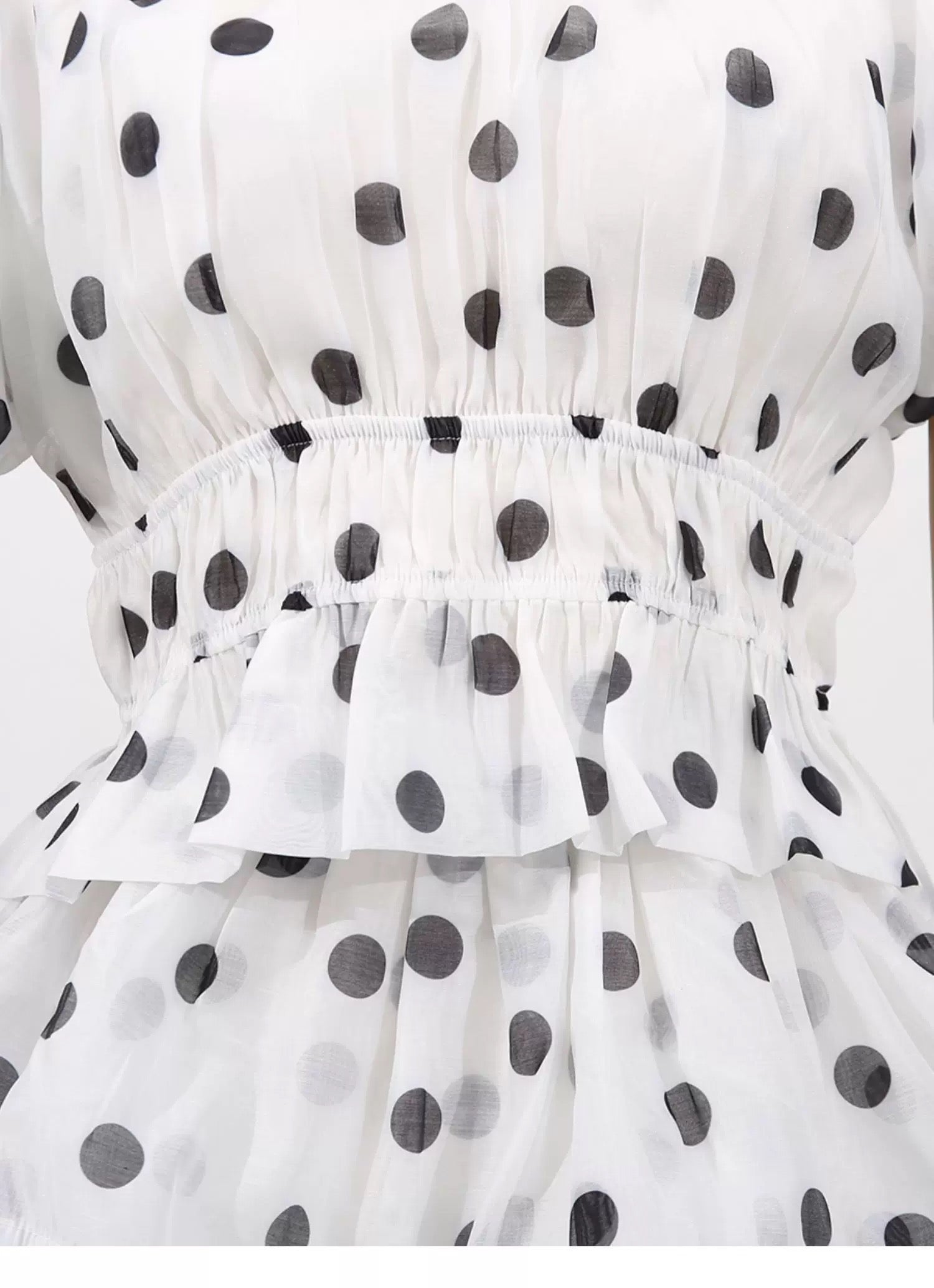 Playful meets polished in the Odette Tiered Dot Dress, a statement piece that balances volume and charm. Featuring puffed short sleeves and a gathered bodice with a cinched waist, the silhouette flows into dramatic tiered layers that cascade with effortless flair. The timeless ivory base is adorned with classic black polka dots, adding a touch of retro whimsy to this modern structured piece.
