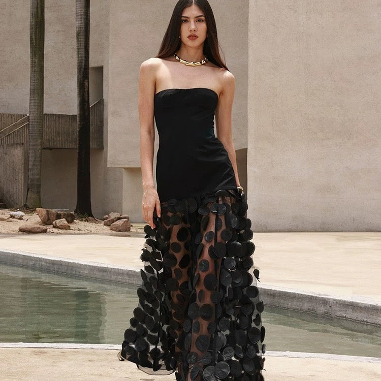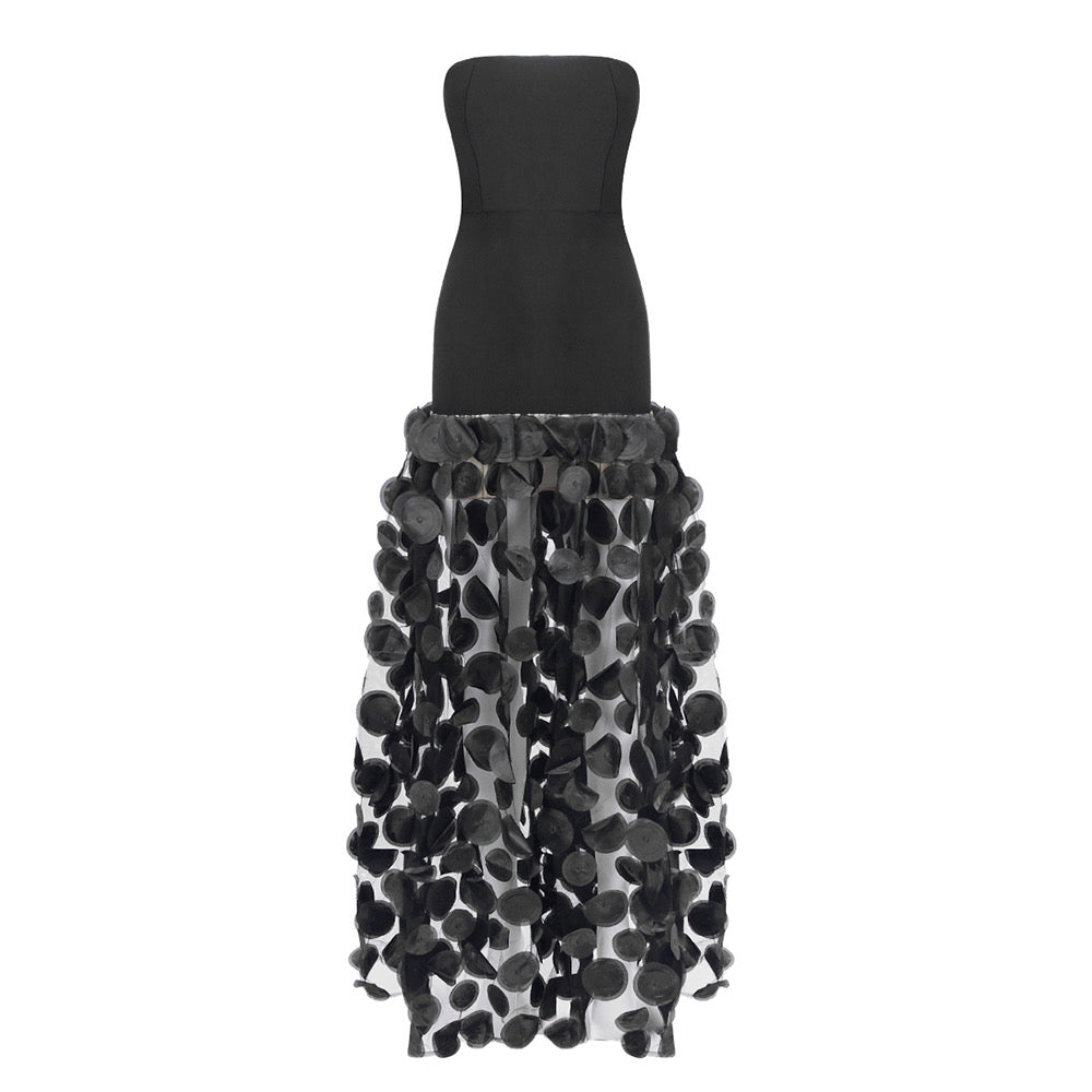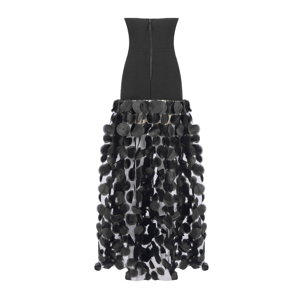 - Sheer floor-length skirt featuring dramatic circular appliqués