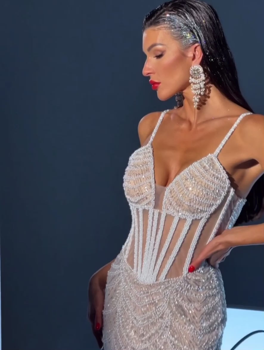 このスパゲッティ パール装飾スパンコール ドレスは、ワードローブに優雅さと輝きを加えます。繊細なパールがストラップを飾り、きらめくスパンコールのディテールが施されたこのドレスは、特別な機会や夜の外出に最適です。体にフィットするシルエットが体型を強調し、シルクのような生地が快適なフィット感を提供します。この素晴らしいドレスを着て、見た目も気分もグラマラスに。