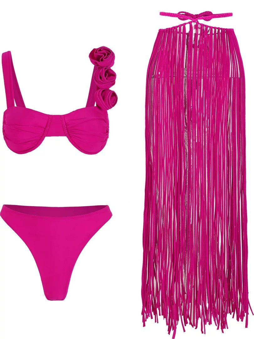 Design Details: This bold three-piece bikini set includes a balconette-style top with structured cups and statement rosette details on one strap, paired with a high-cut bikini bottom for a flattering silhouette. It comes with a matching cover-up skirt featuring cascading fringe and a braided waist tie for dramatic movement and flair.