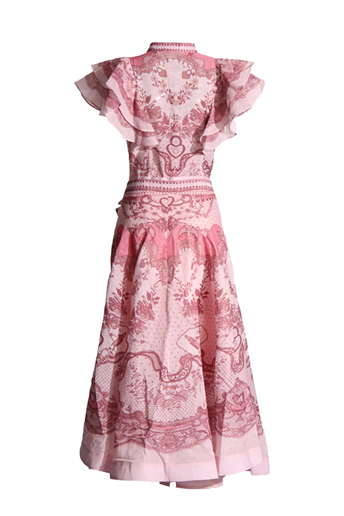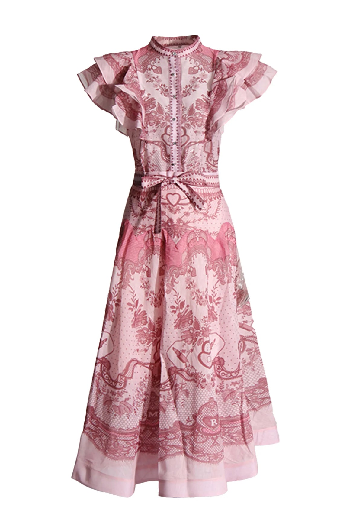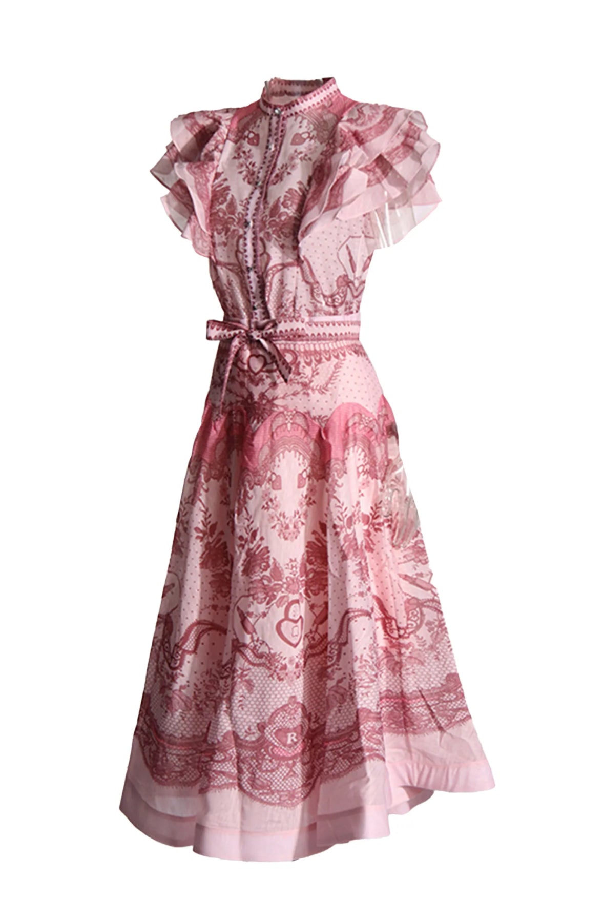 Romantic and refined, the Rosalie Vintage Ruffle Set is a love letter to timeless femininity. The blouse features structured ruffled sleeves, a mandarin collar, and delicate button detailing down the front, all adorned in a detailed rouge-hued baroque motif. Paired with a high-waisted A-line midi skirt, this set flows with grace and elegance, while the heart and ribbon motifs woven into the print add a soft, whimsical charm. The fabric is airy yet holds its shape, perfect for warm-weather sophistication.
