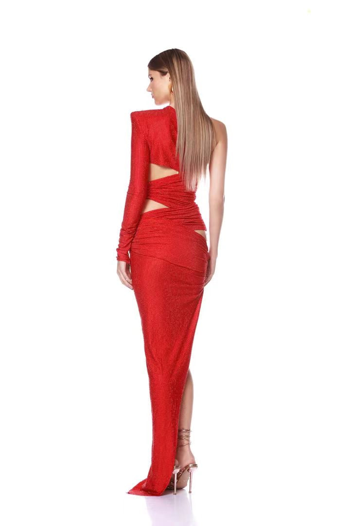 Design Details: This striking one-shoulder gown features intricate side cutouts and artful ruching that sculpts the silhouette. The asymmetric neckline and single long sleeve create bold contrast, while the shimmering fabric delivers maximum glam. A back slit adds movement and allure.