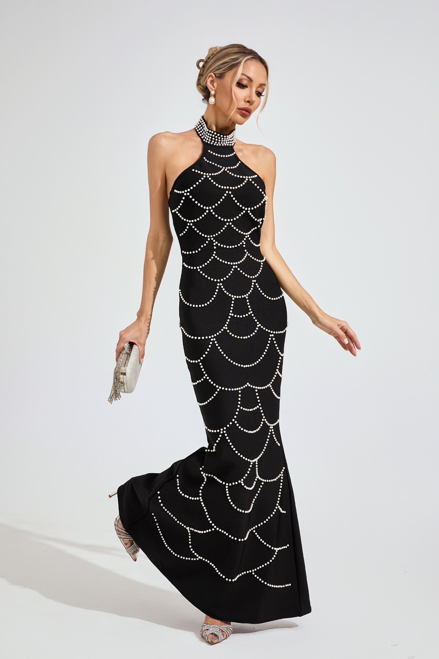 - Full rhinestone pearl chain embellishments in a scallop pattern