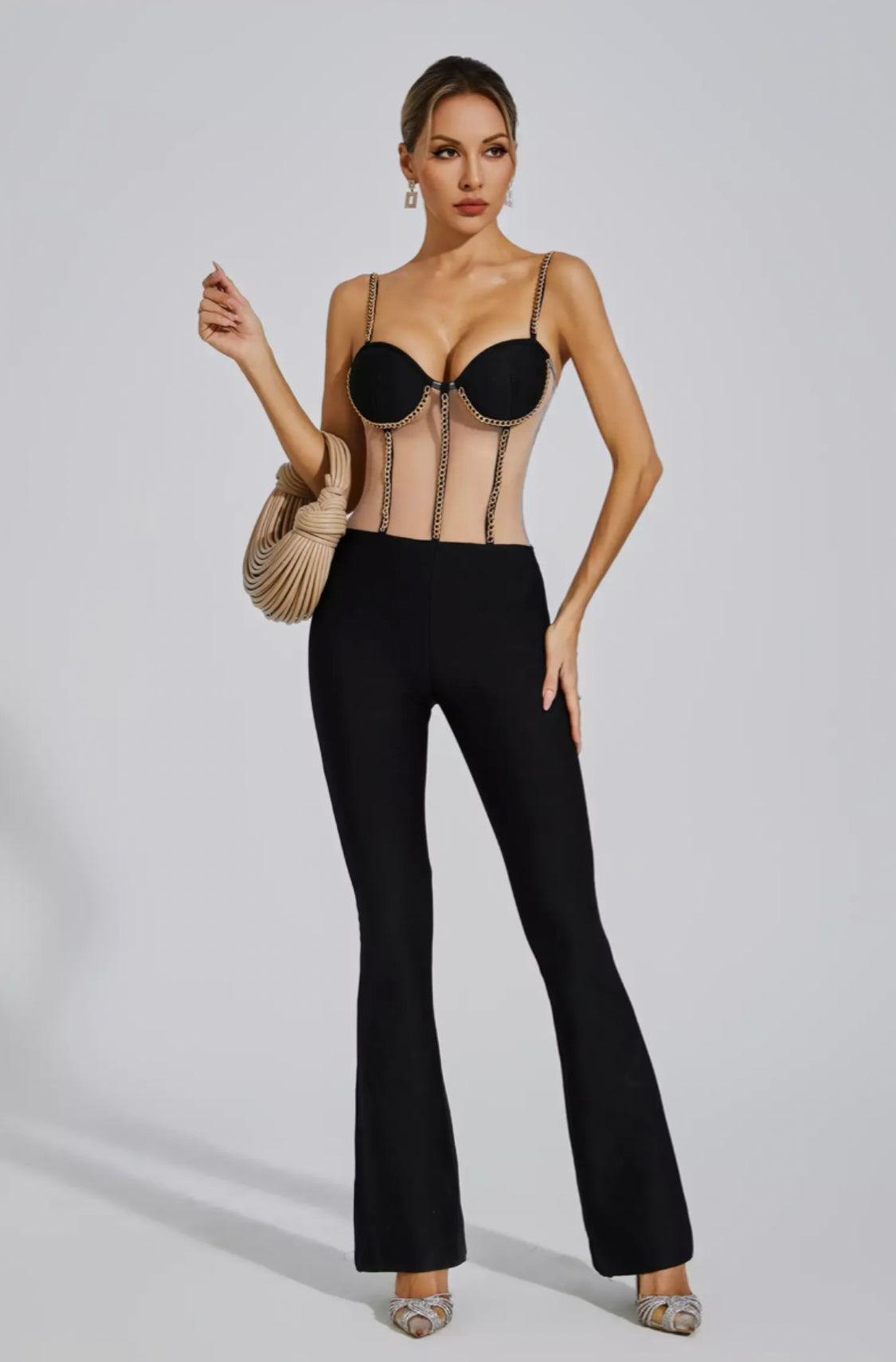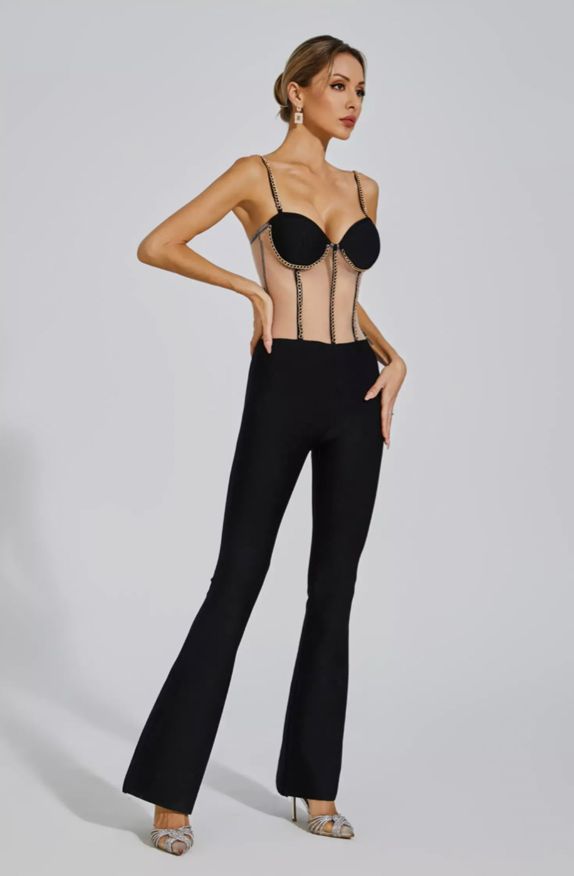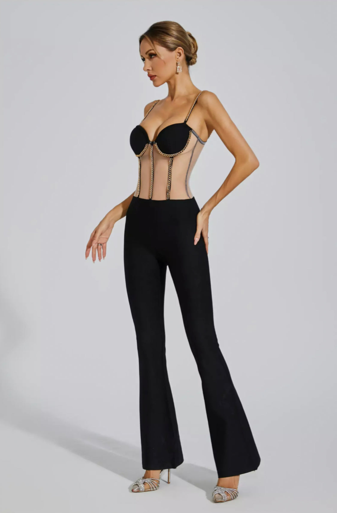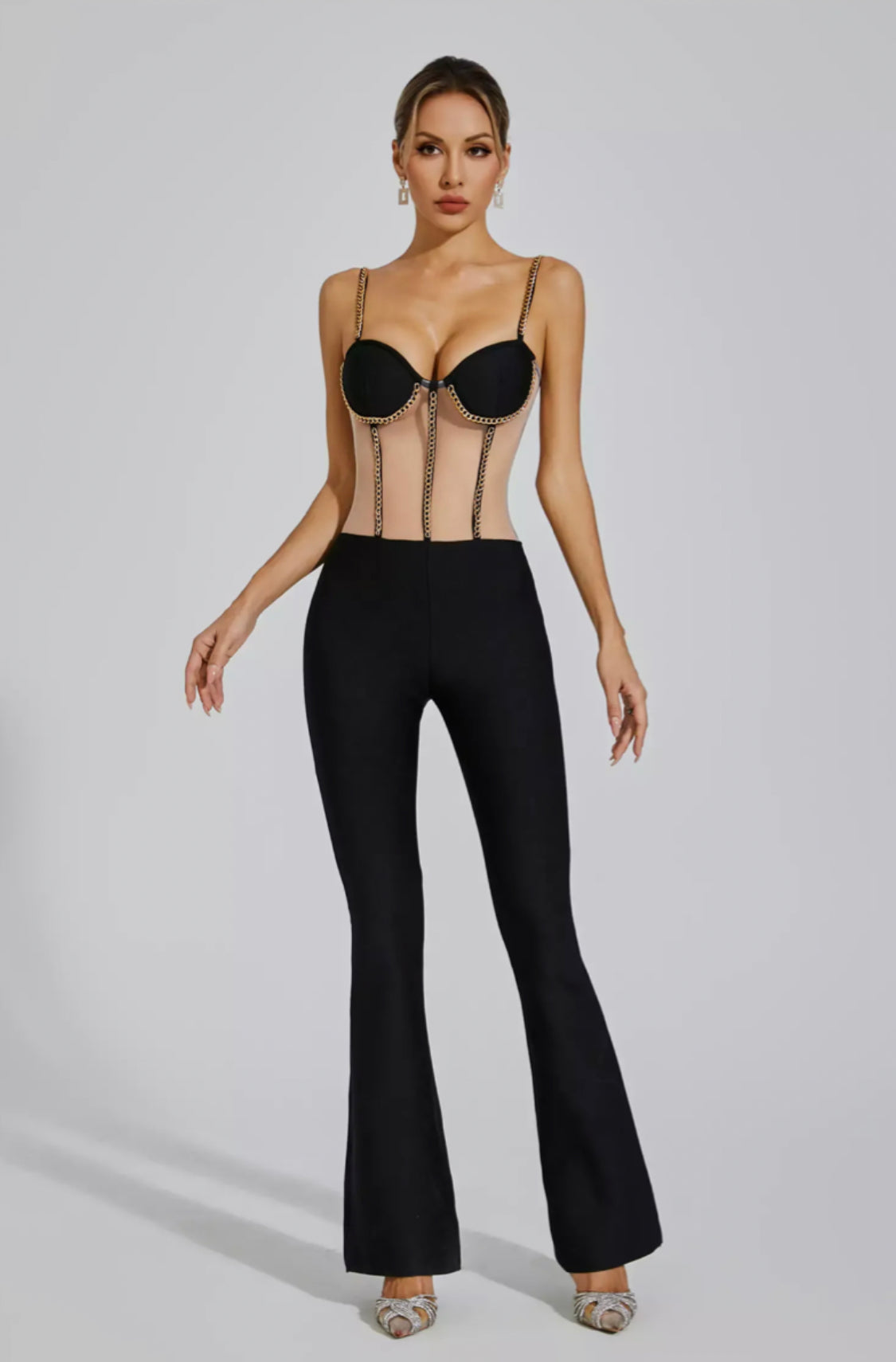 The Sara Black Mesh Jumpsuit is the epitome of style and sensuality. Its sleek and fitted design accentuates your body shape, while the mesh detailing adds a touch of edginess. With its stretchy fabric and backless halterneck, this jumpsuit effortlessly combines comfort and allure. A must-have for those looking to make a statement.