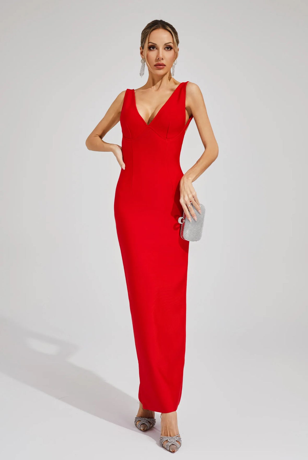A timeless statement piece, the Valentina gown features a sleek body-contouring silhouette with a deep V neckline and structured bust. The show-stopping backless design exudes confidence, while the subtle back slit ensures ease of movement. Clean lines, flawless tailoring, and minimal seams make this a modern red carpet essential.