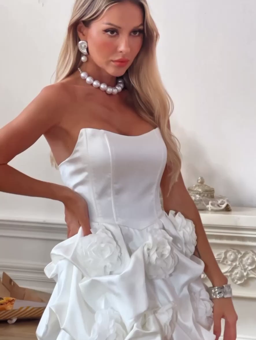 The Strapless Flower Satin Mini Dress is a stunning addition to any wardrobe. Crafted with delicate satin and adorned with intricate flower detailing, this dress is perfect for any special occasion. The strapless design allows for effortless elegance, while the mini length adds a touch of flirty fun. Make a statement and turn heads in this one-of-a-kind dress!