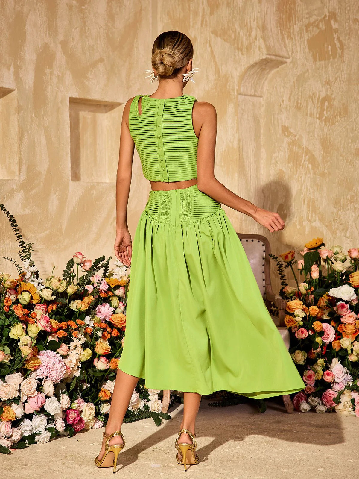 - Two-piece set featuring a cropped sleeveless top with a pleated texture and keyhole detail