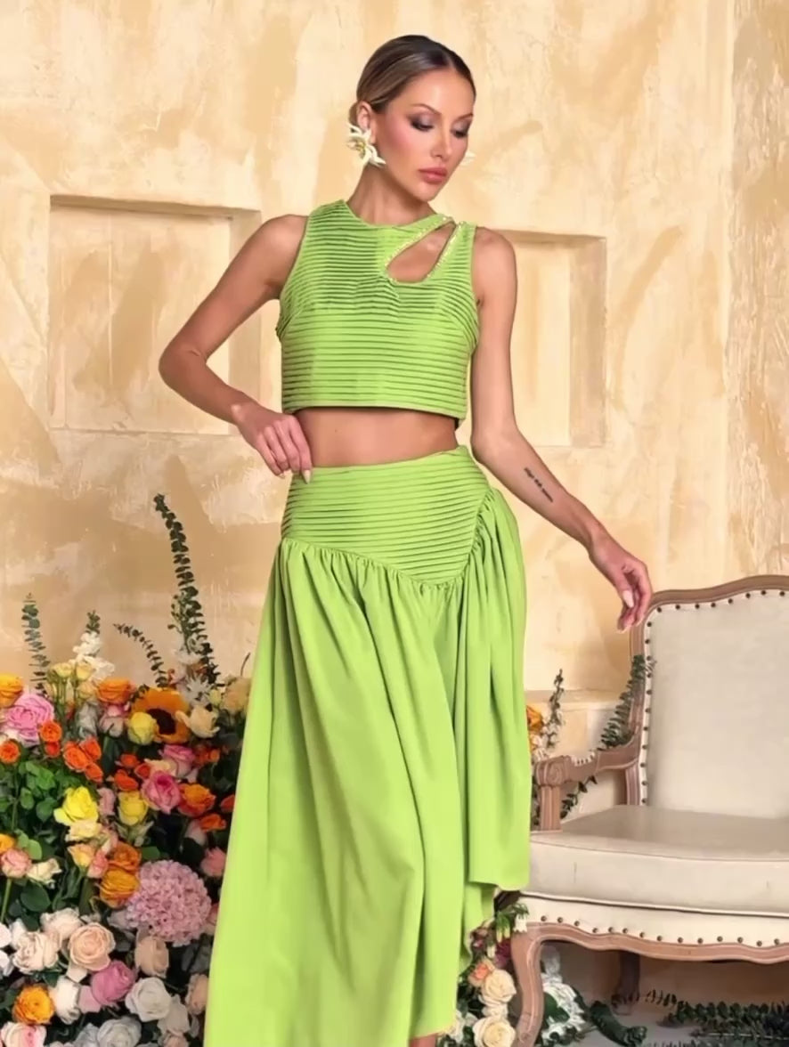- Matching high-waisted A-line skirt with gathered ruching and a soft drape