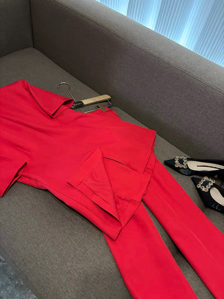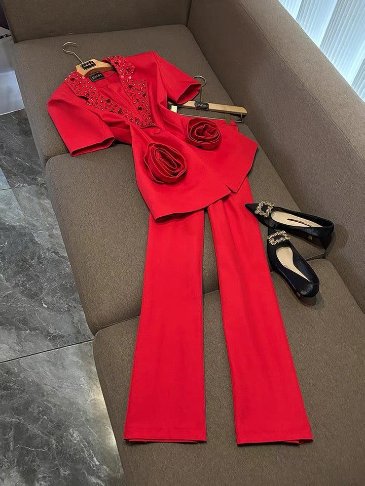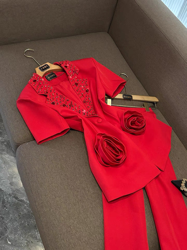 This head-turning two-piece set features a sharply tailored short-sleeve blazer adorned with sparkling rhinestones along the lapel and two sculpted 3D roses at the waist for a bold statement. The matching flared trousers balance the look with a clean, elongated silhouette, while the fitted top sculpts the waist beautifully.