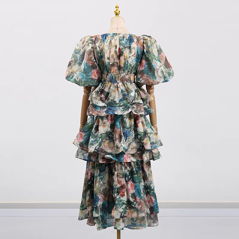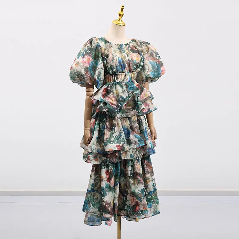 The Camille Tiered Puff Dress Set is the embodiment of playful elegance and volume. Featuring a dramatic puff-sleeve top with a cinched waist and two structured peplum tiers, it creates a dreamy, floating silhouette that is both romantic and statement-making. The matching flared midi skirt continues the ethereal feel with layers of sheer organza and fluid movement. Available in soft yellow with a subtle palm motif or a painterly floral print, this set captures the essence of whimsical luxury.