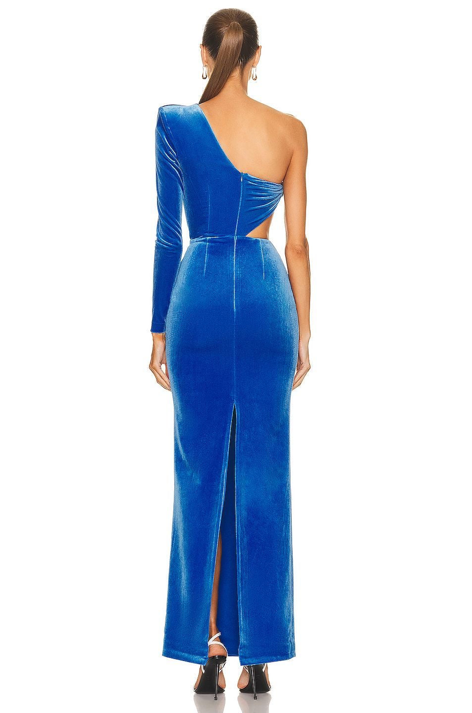 This captivating set features a one-shoulder velvet crop top with elegant diagonal draping and a flattering cutout at the waist. Paired with a sleek high-waisted velvet maxi skirt that hugs the hips and flows down to a chic ankle-length finish, complete with a back slit for ease of movement. The ultra-rich sapphire tone and figure-enhancing fit create a head-turning silhouette.