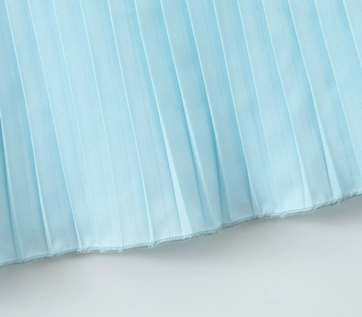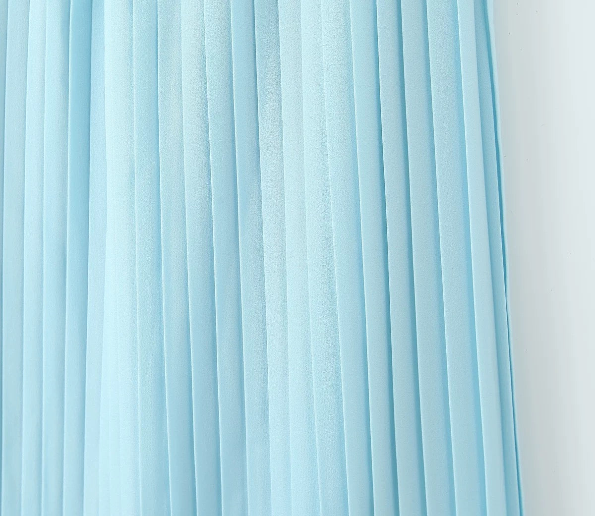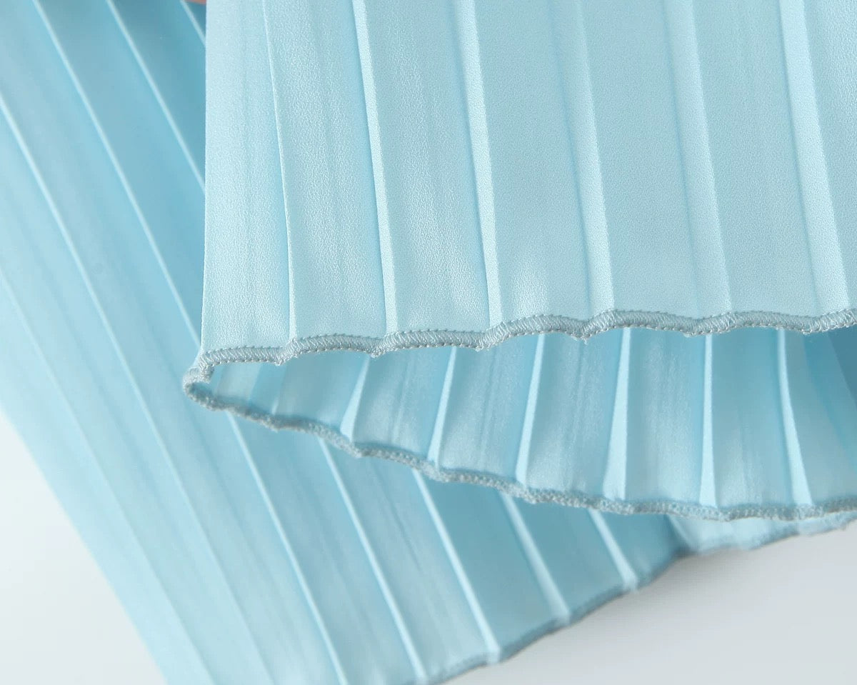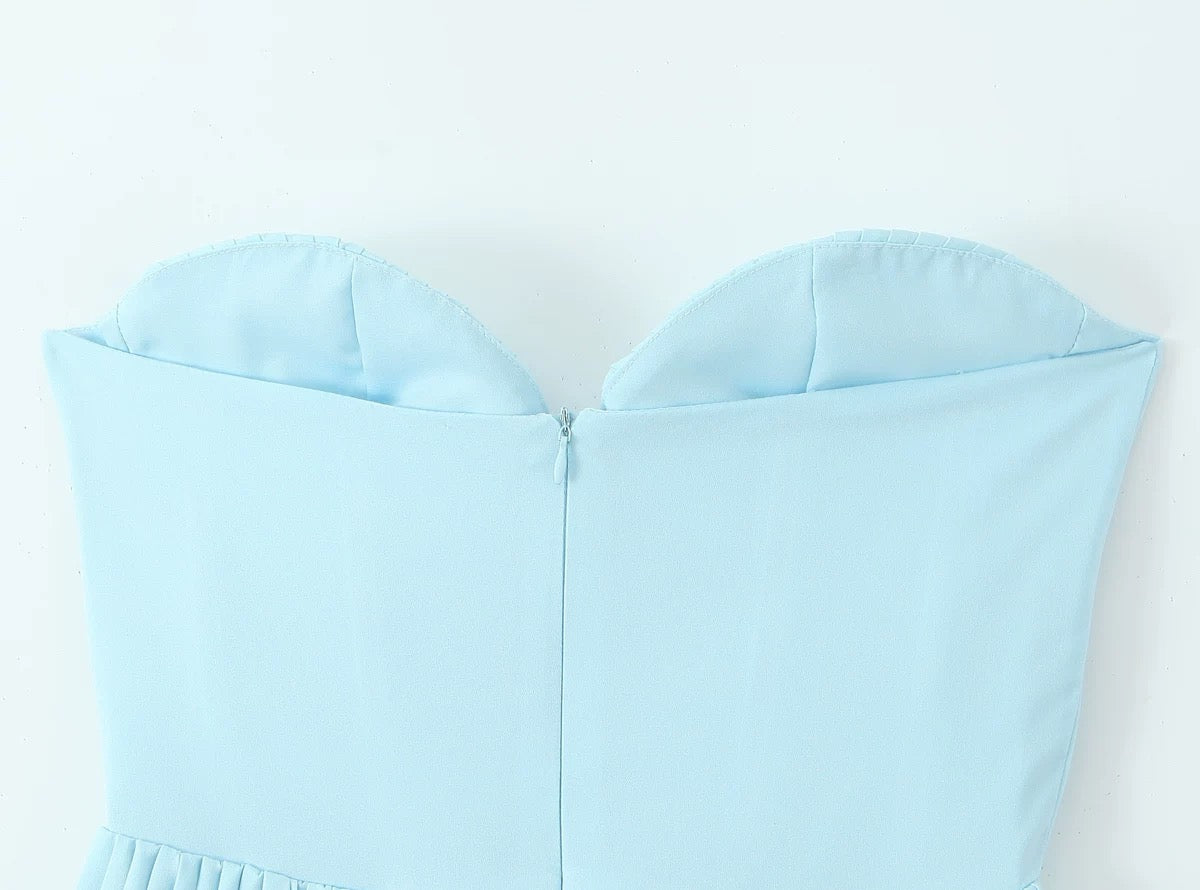 This elegant pleated gown features a structured bustier-style bodice with molded cups and delicate pleating for added texture and lift. The high-waisted silhouette flows into a fully pleated A-line skirt, offering movement and grace with every step. The strapless neckline elongates the neckline and highlights the shoulders, while the back zip ensures a smooth fit.
