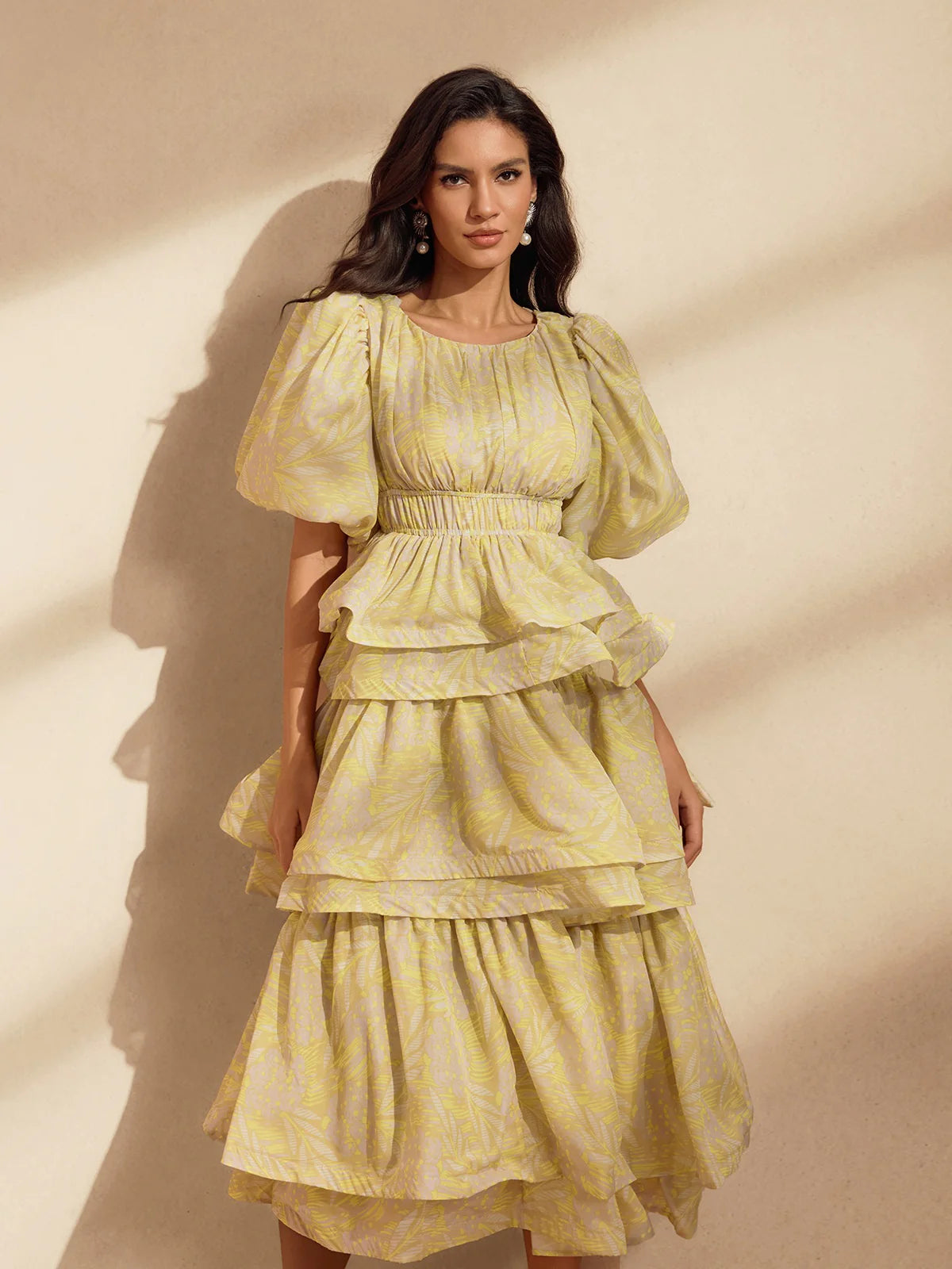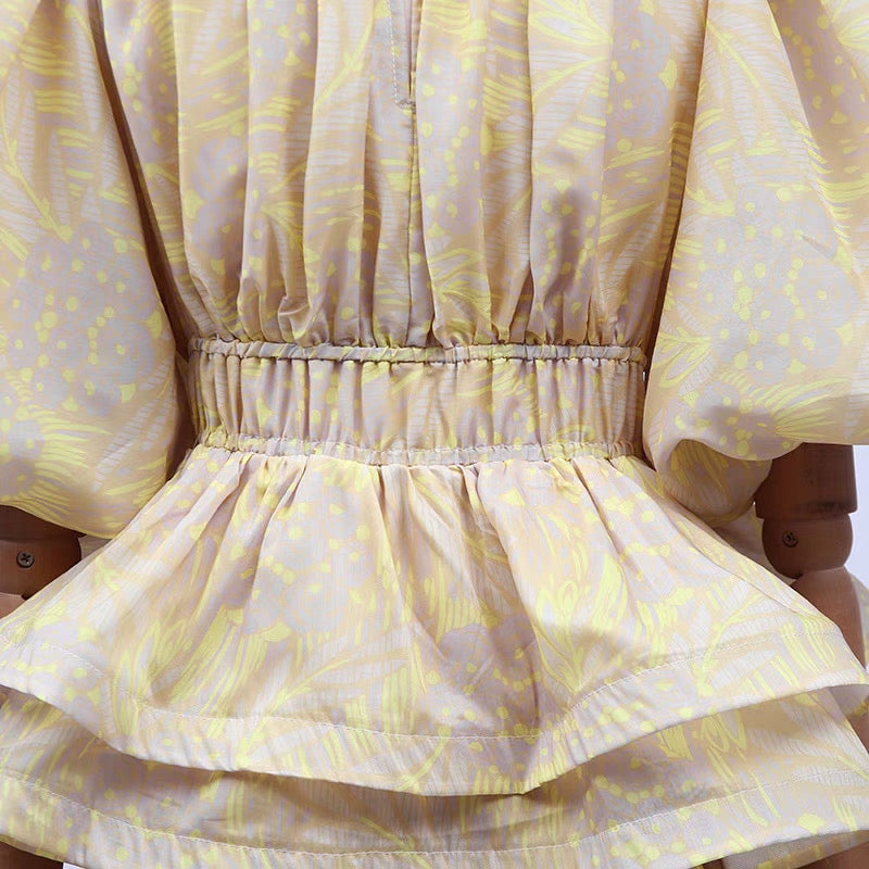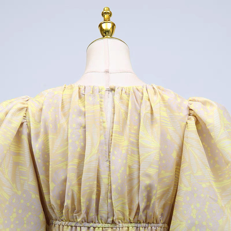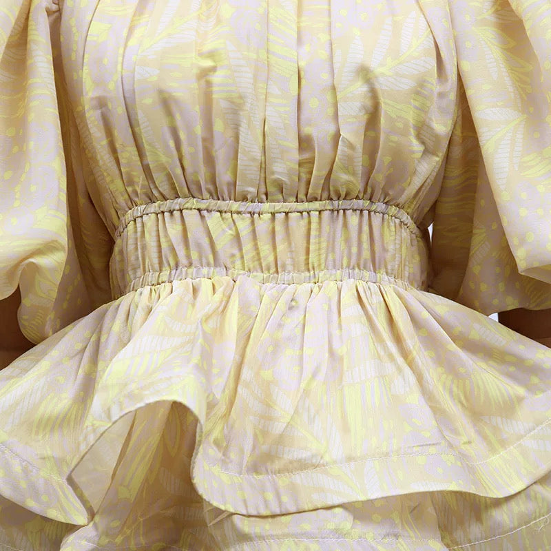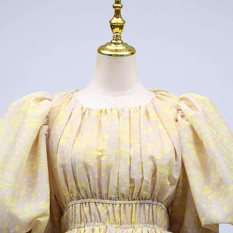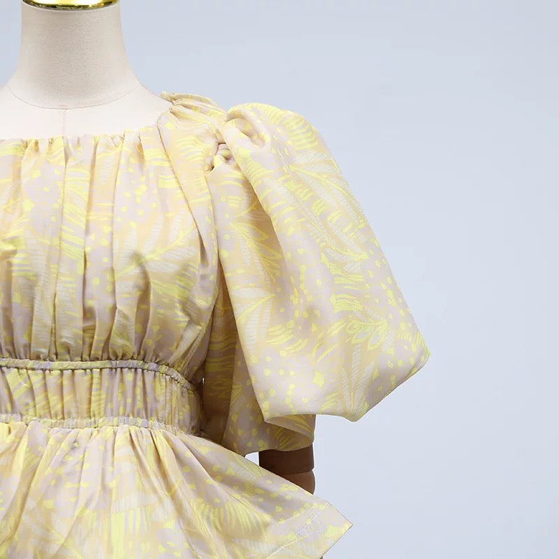 The Camille Tiered Puff Dress Set is the embodiment of playful elegance and volume. Featuring a dramatic puff-sleeve top with a cinched waist and two structured peplum tiers, it creates a dreamy, floating silhouette that is both romantic and statement-making. The matching flared midi skirt continues the ethereal feel with layers of sheer organza and fluid movement. Available in soft yellow with a subtle palm motif or a painterly floral print, this set captures the essence of whimsical luxury.