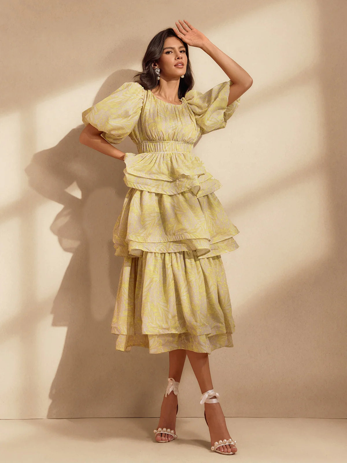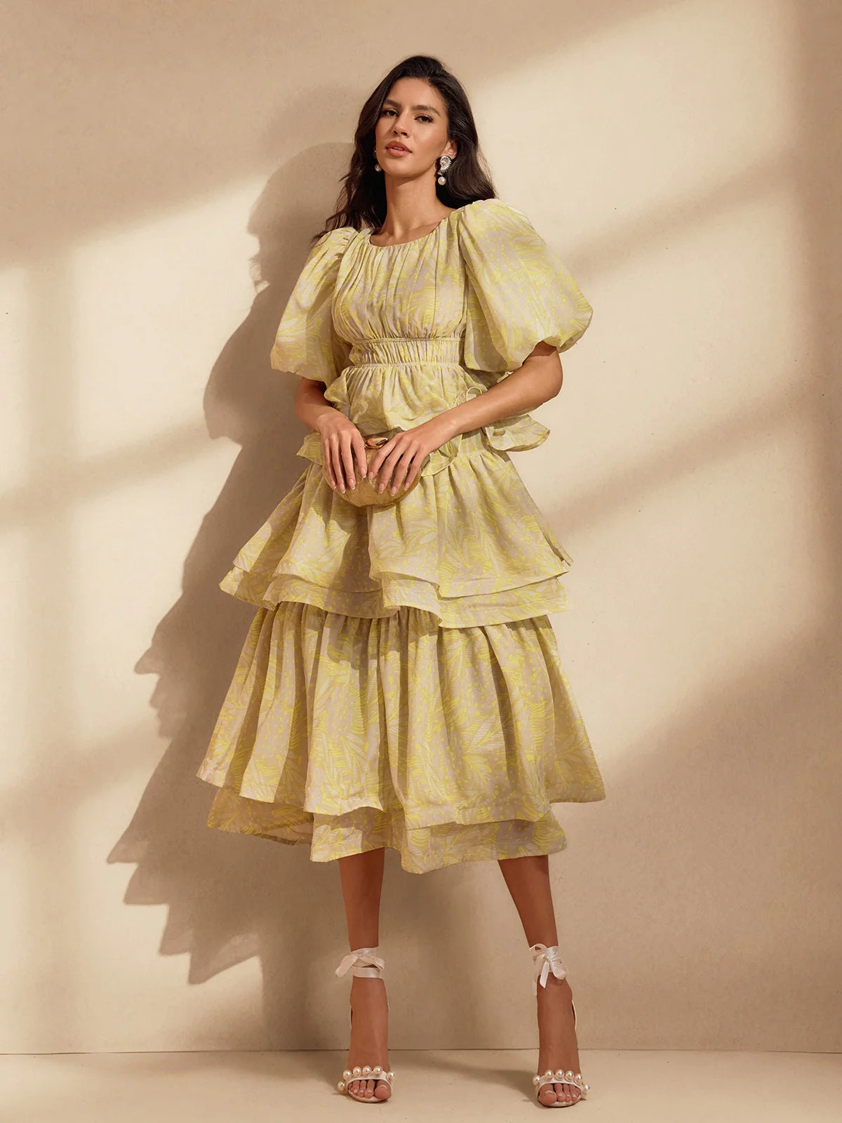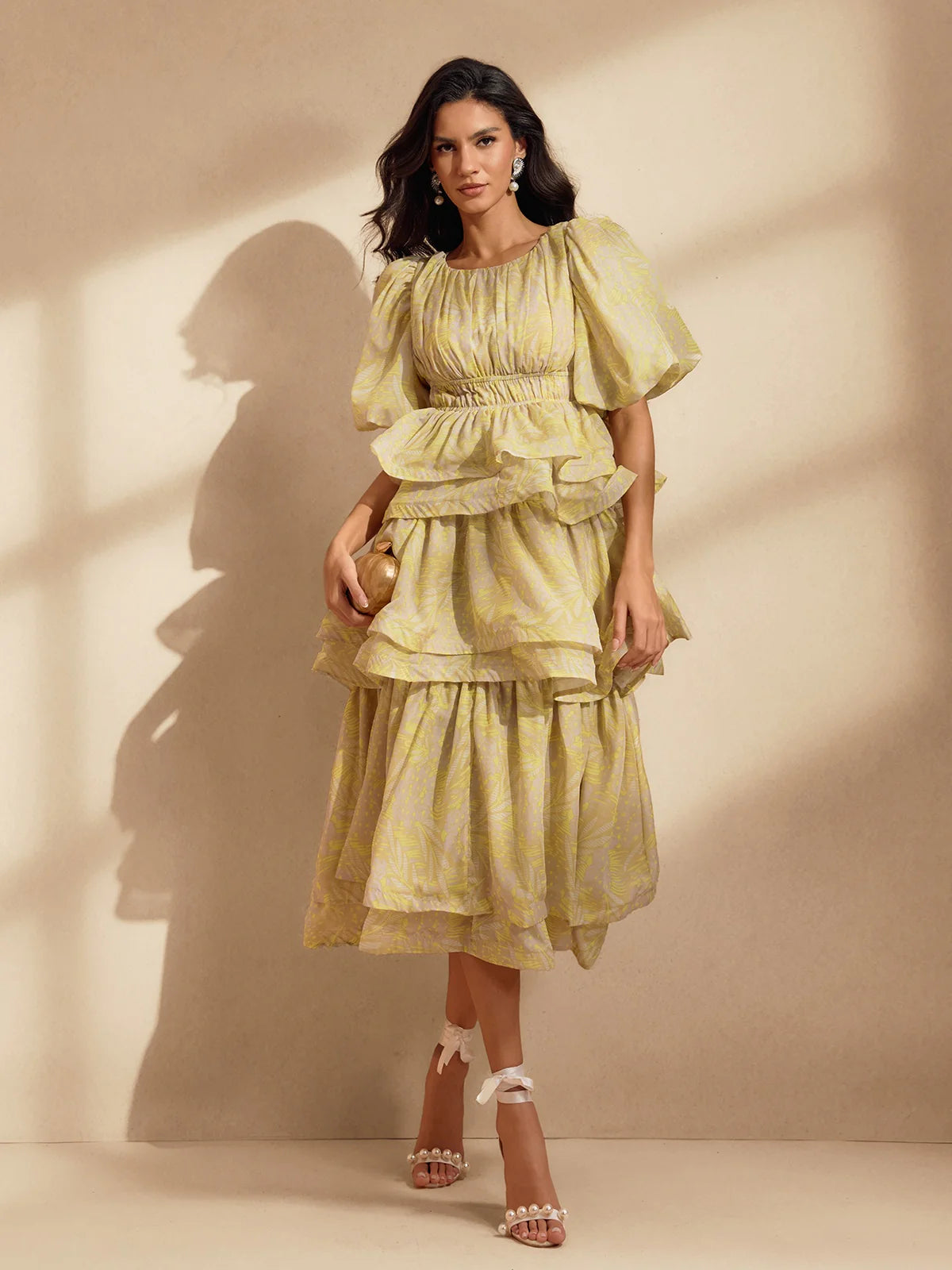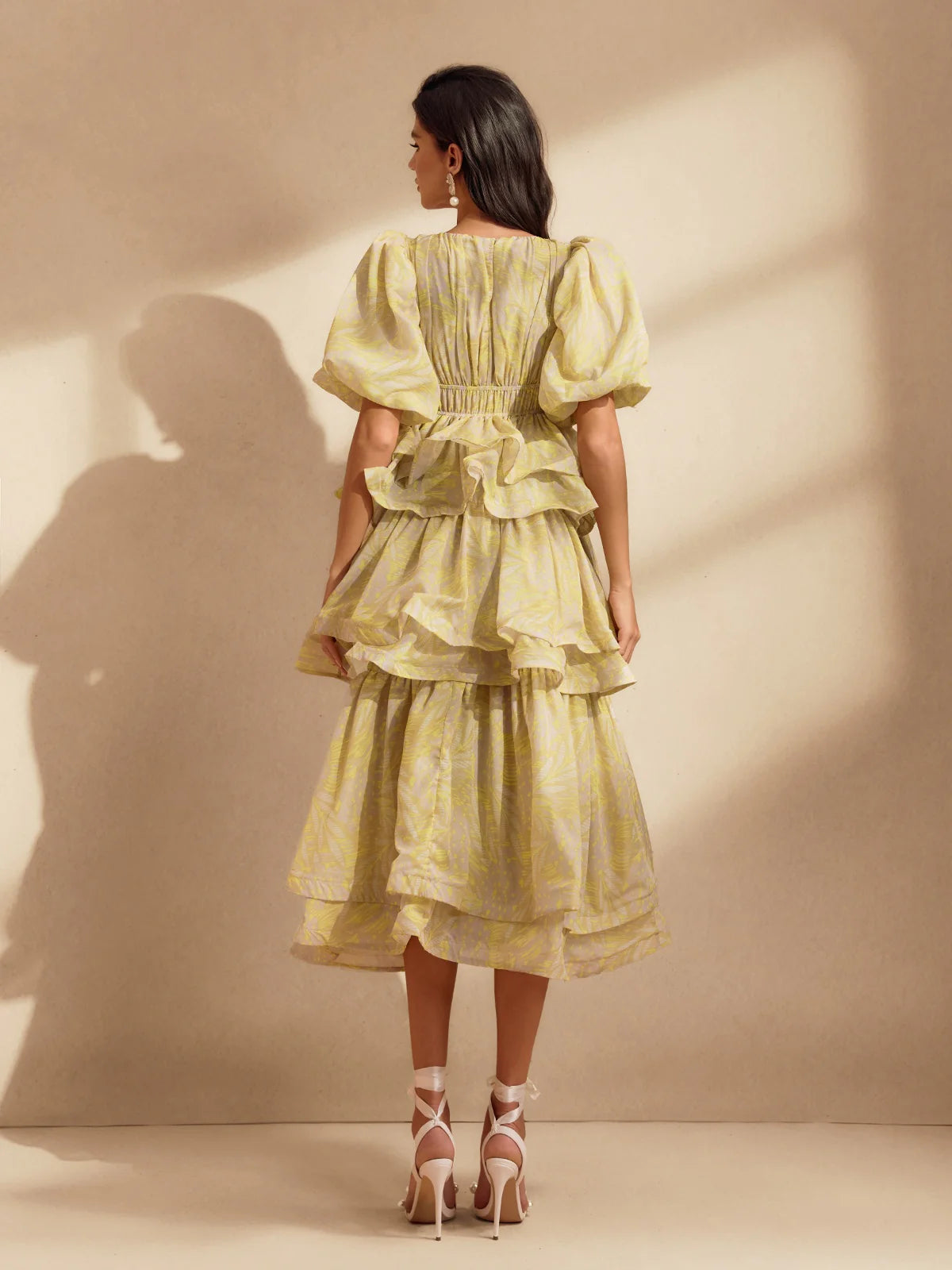 The Camille Tiered Puff Dress Set is the embodiment of playful elegance and volume. Featuring a dramatic puff-sleeve top with a cinched waist and two structured peplum tiers, it creates a dreamy, floating silhouette that is both romantic and statement-making. The matching flared midi skirt continues the ethereal feel with layers of sheer organza and fluid movement. Available in soft yellow with a subtle palm motif or a painterly floral print, this set captures the essence of whimsical luxury.