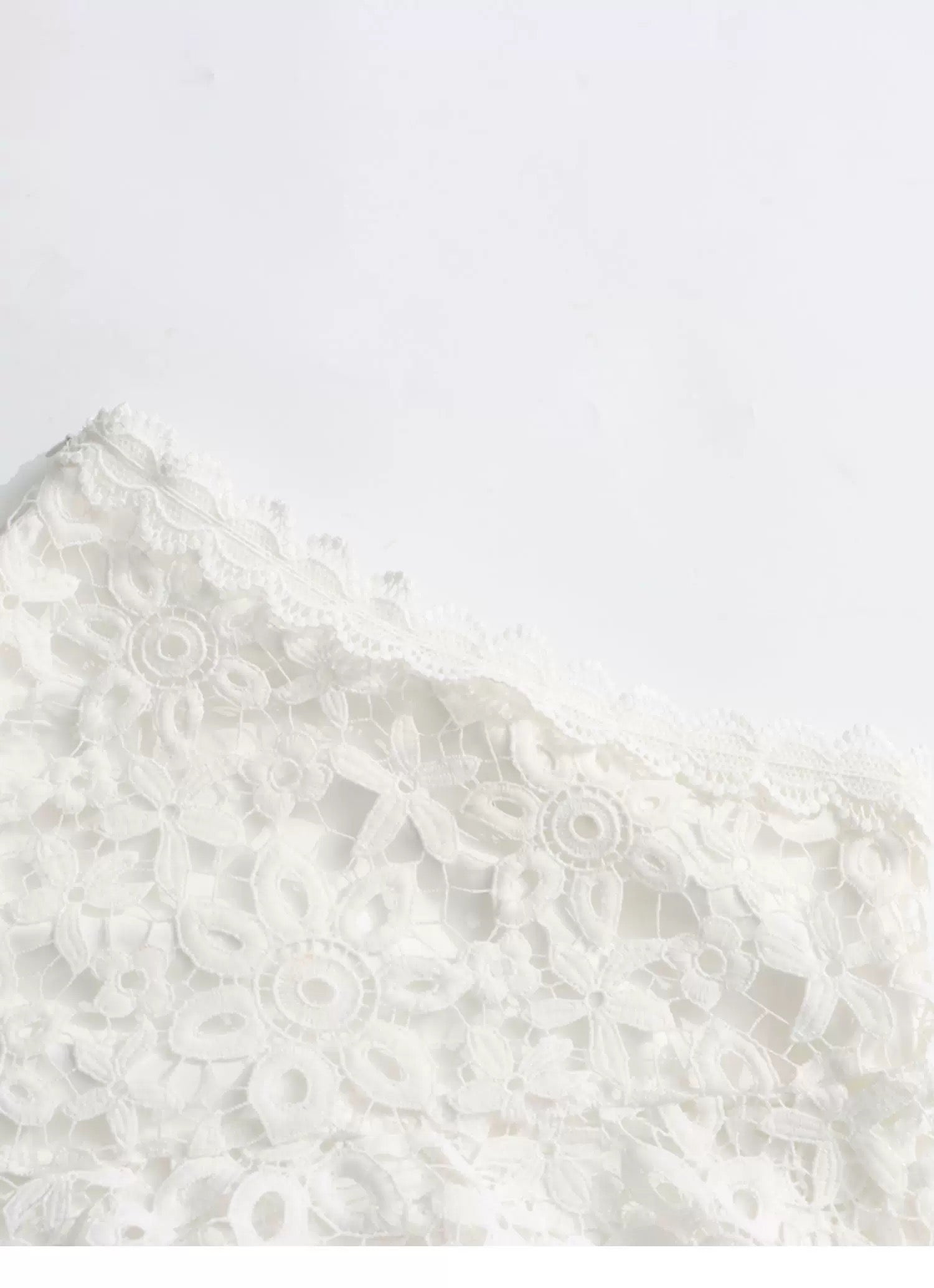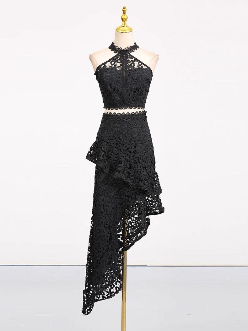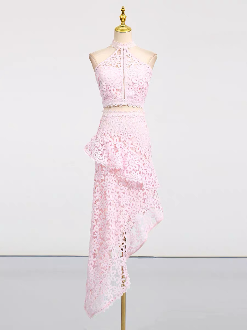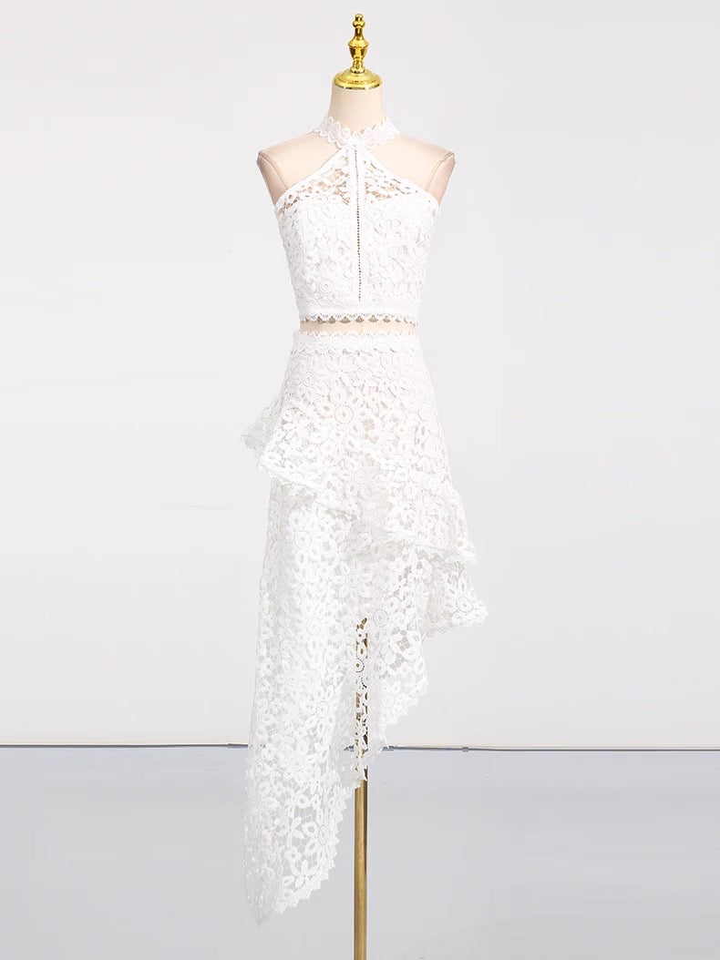 - Elegant two-piece lace set with sleeveless high-neck crop top
