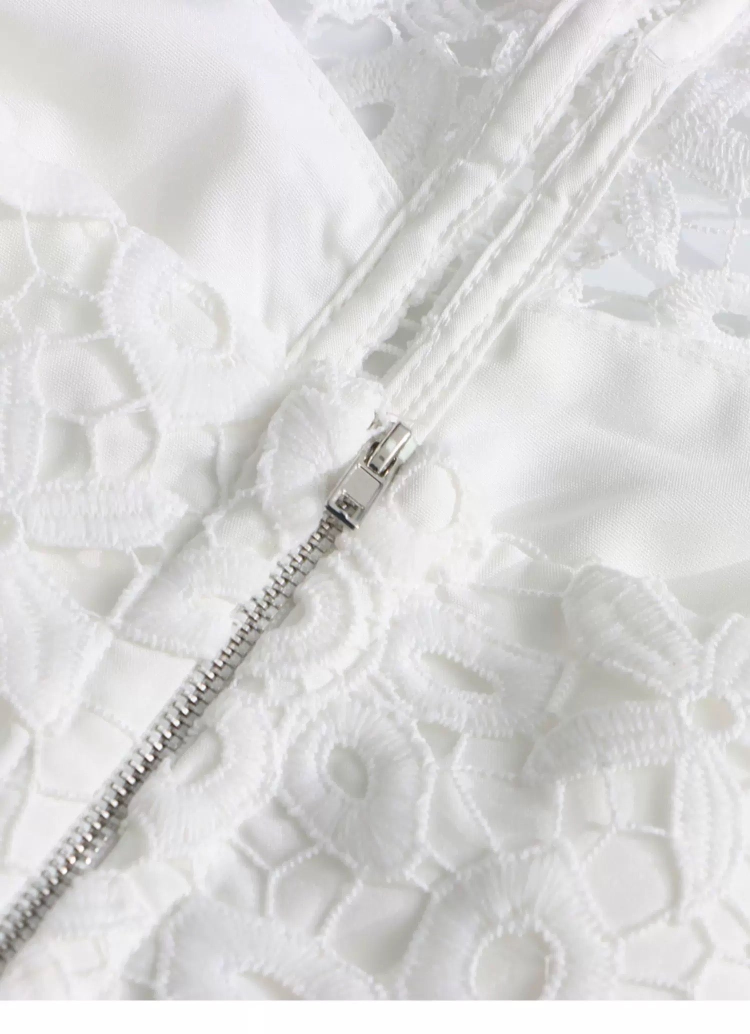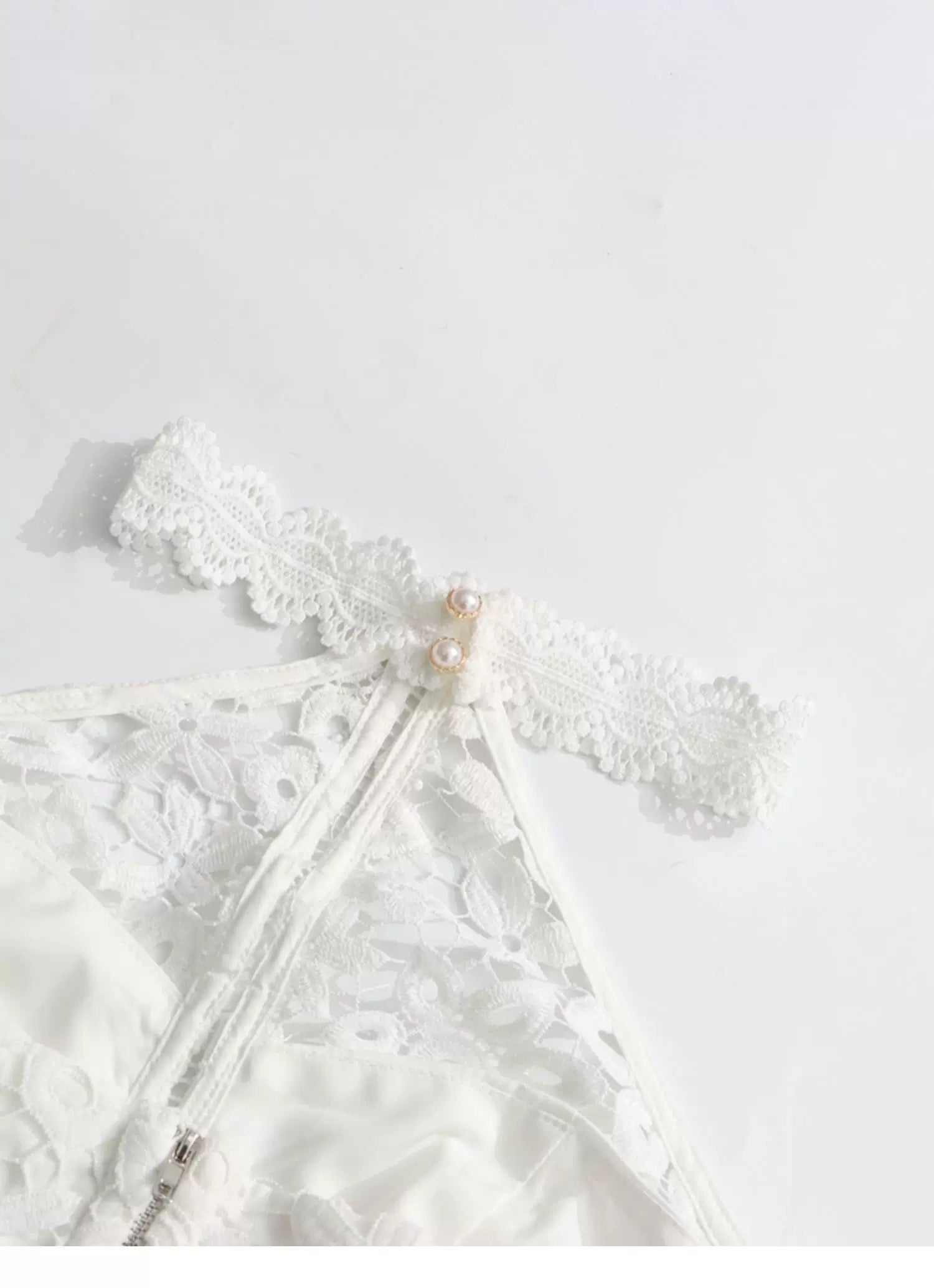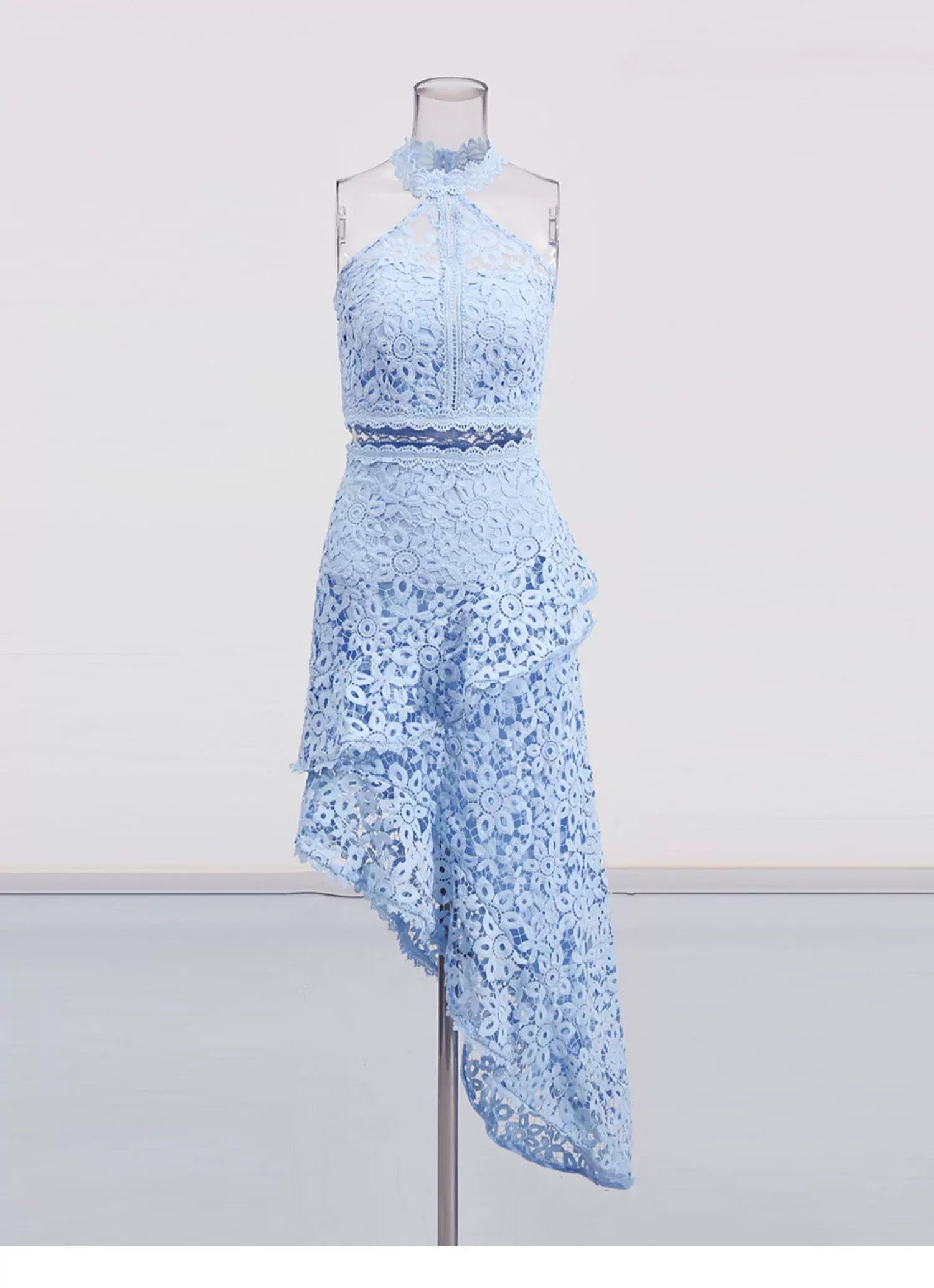- Elegant two-piece lace set with sleeveless high-neck crop top