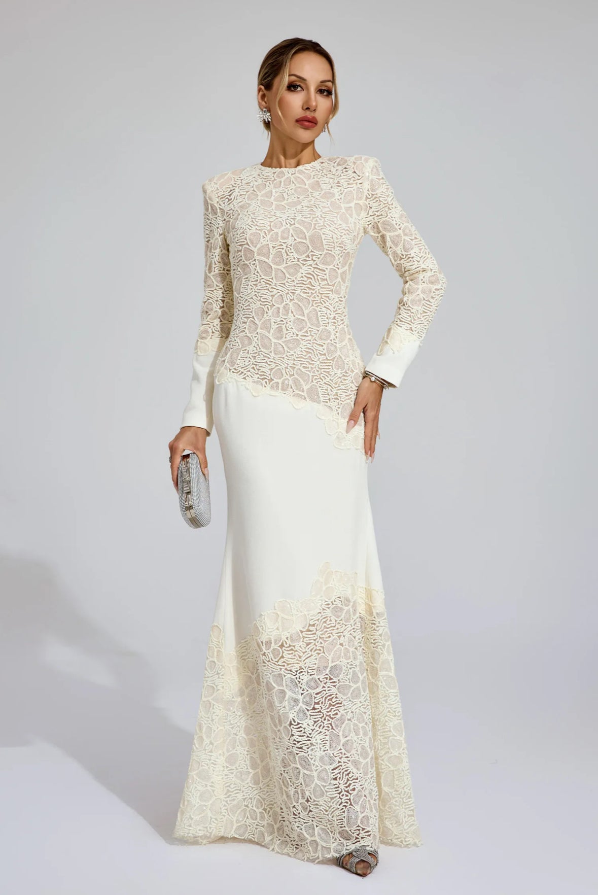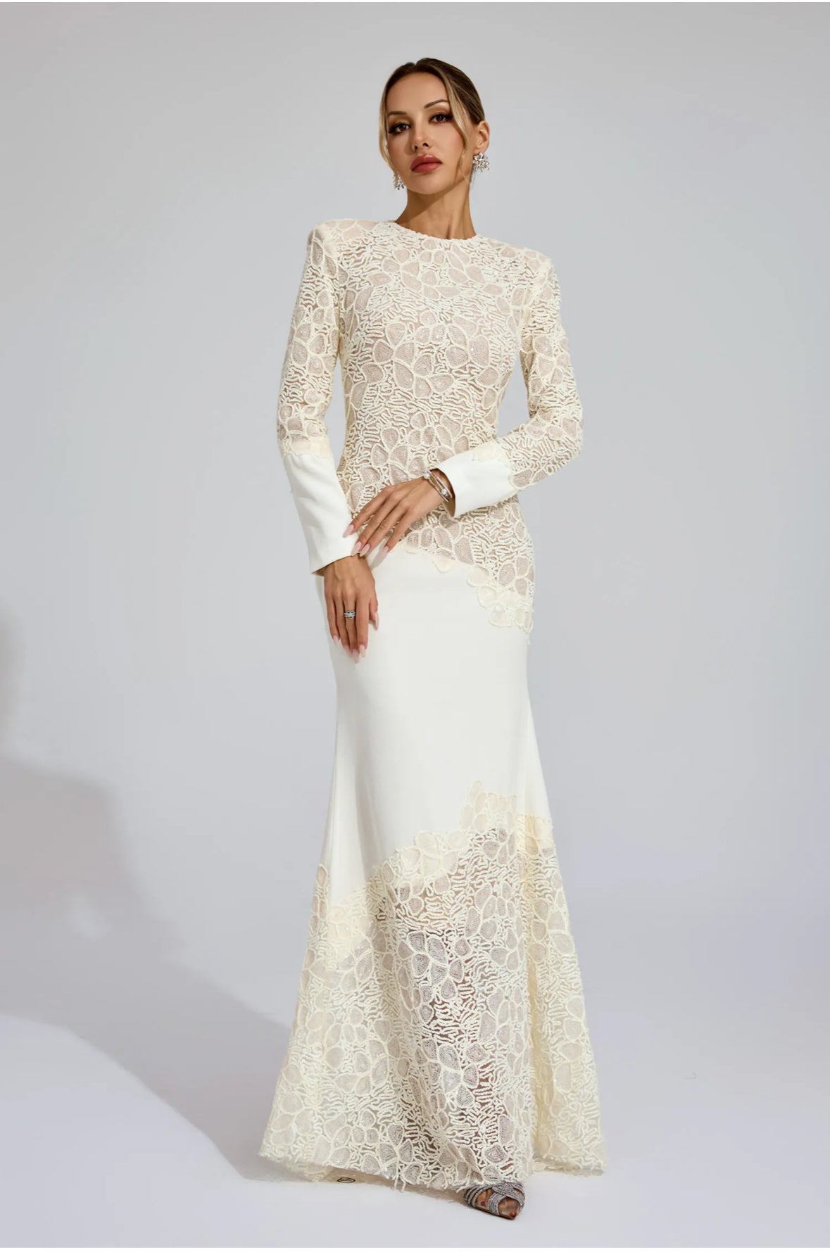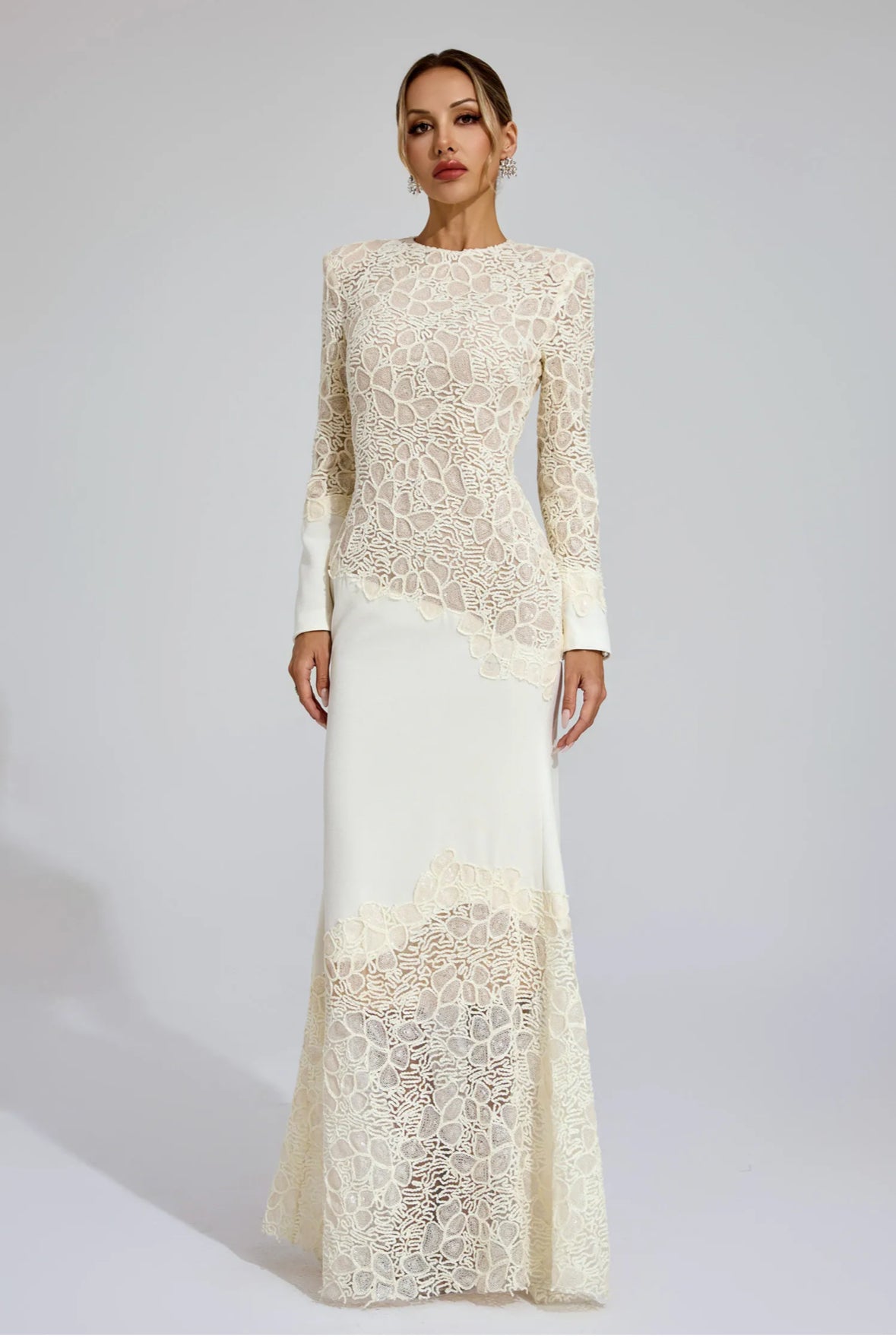 This ultra-elegant floor-length gown features a tailored silhouette adorned with intricate lace paneling that artfully contours the figure. A high neckline and long sleeves add regal sophistication, while the strategic sheer placements bring modern contrast and allure. Designed to elongate the form with a graceful flare from the knees down, it’s a timeless fusion of romance and power.