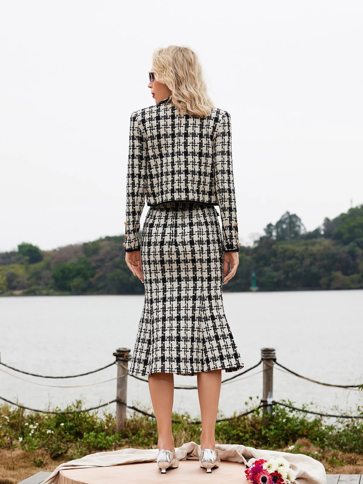 This Elsa Houndstooth Skirt Three Piece Set is a must-have for any fashion-forward wardrobe. The classic houndstooth pattern is elevated with a modern twist, and the three-piece set offers versatility and endless styling options. Crafted from high-quality material, this set is perfect for all occasions.