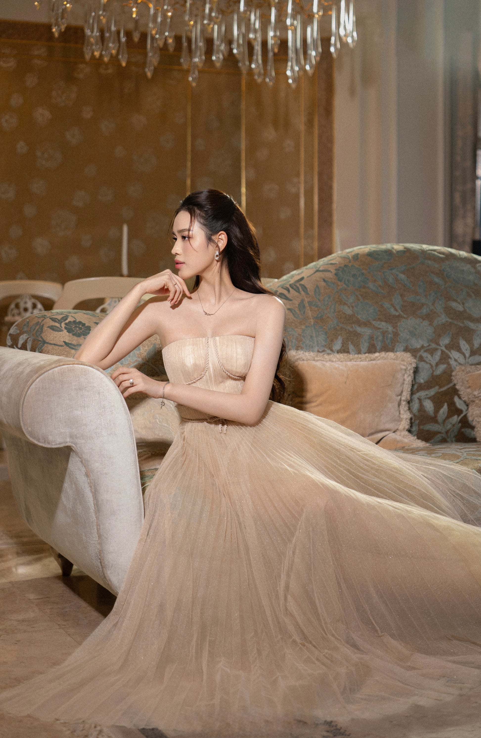 - Floor-length silhouette with graceful volume