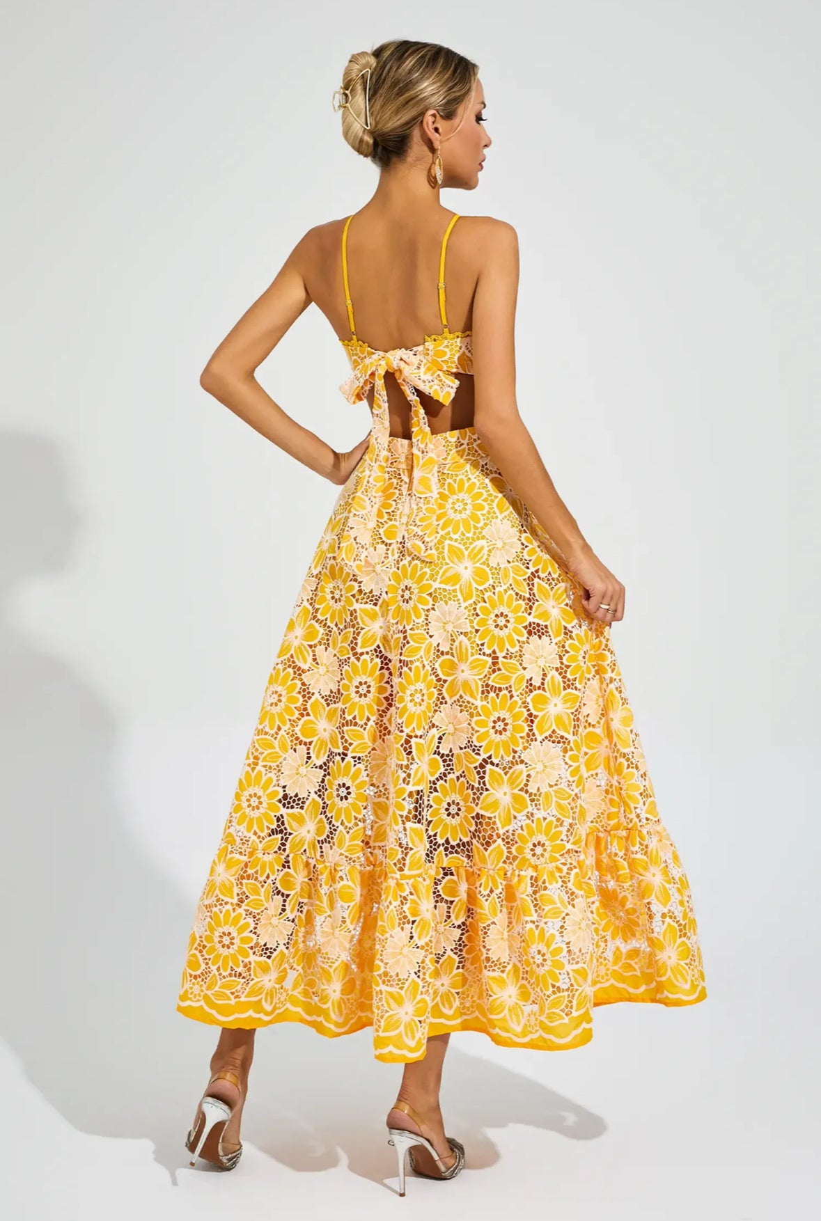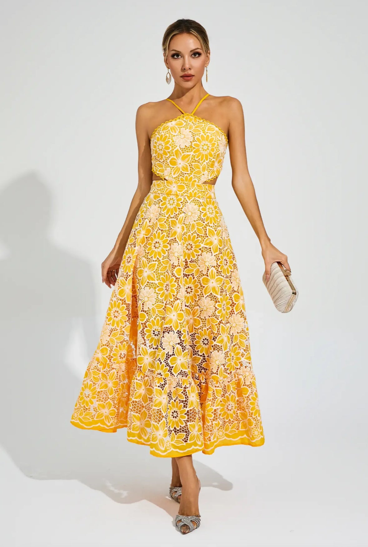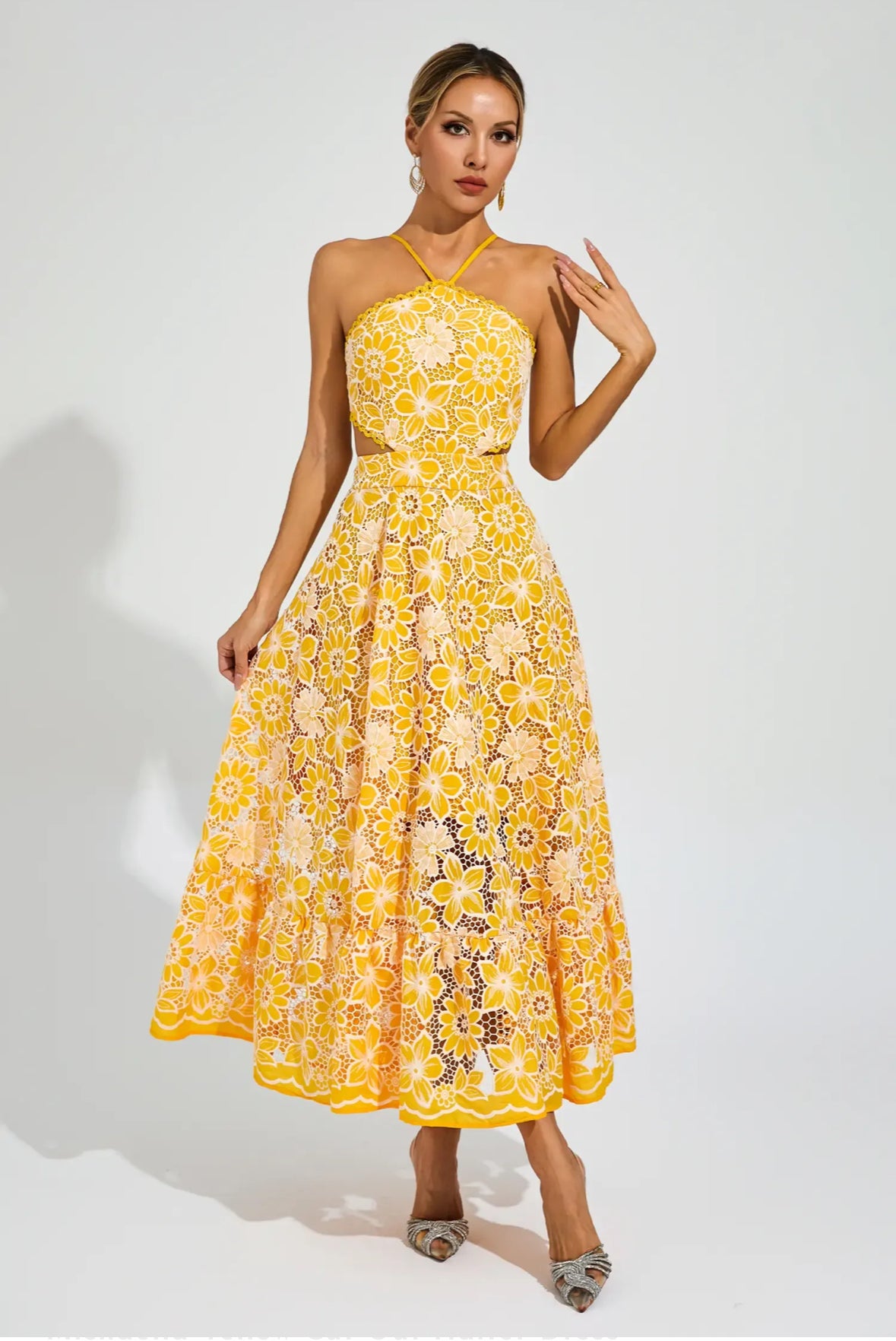 The Fiora Embroidered Lace Midi Dress is a floral fantasy crafted to dazzle under the sun or the stars. With its scalloped halter neckline and flattering waistband, the bodice elegantly frames the shoulders while highlighting the waist. The intricately embroidered daisy lace flows into a voluminous A-line midi skirt with soft tiers for movement. Peekaboo cutouts at the waist on the navy version add a touch of intrigue, while the yellow variation keeps it sweet and summery.