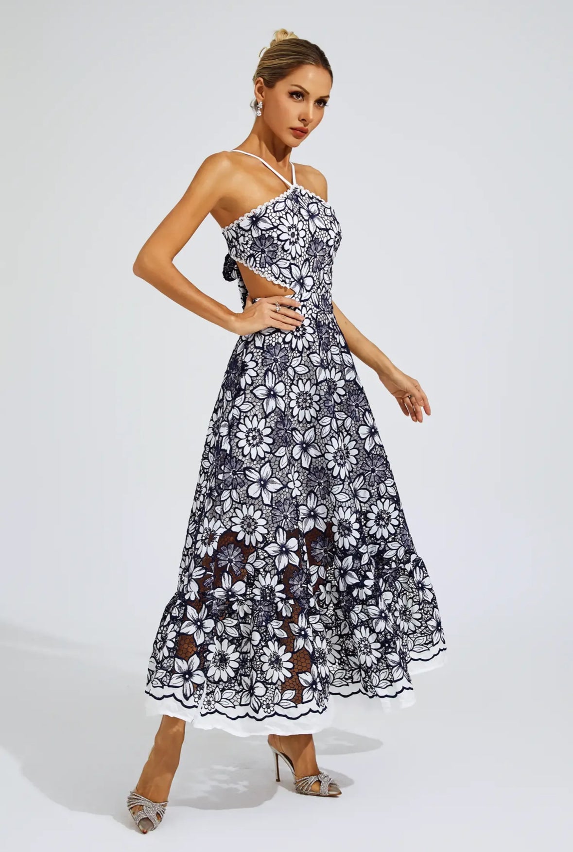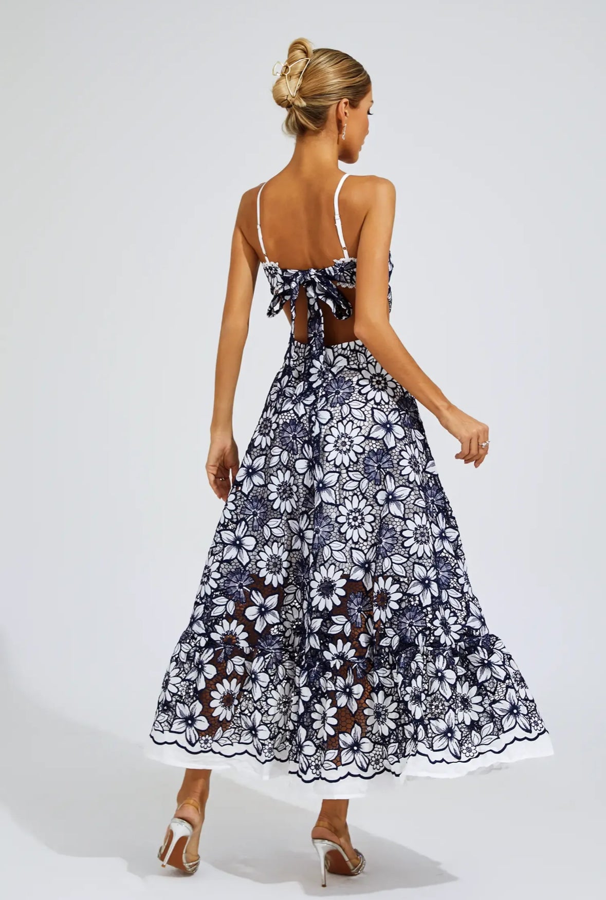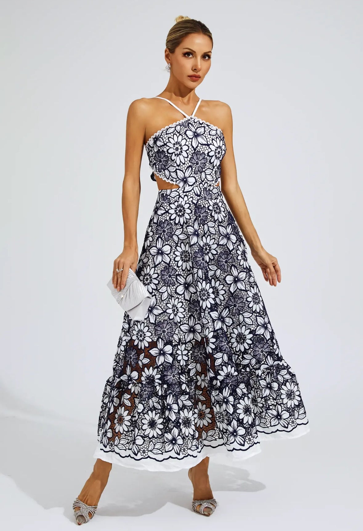 The Fiora Embroidered Lace Midi Dress is a floral fantasy crafted to dazzle under the sun or the stars. With its scalloped halter neckline and flattering waistband, the bodice elegantly frames the shoulders while highlighting the waist. The intricately embroidered daisy lace flows into a voluminous A-line midi skirt with soft tiers for movement. Peekaboo cutouts at the waist on the navy version add a touch of intrigue, while the yellow variation keeps it sweet and summery.