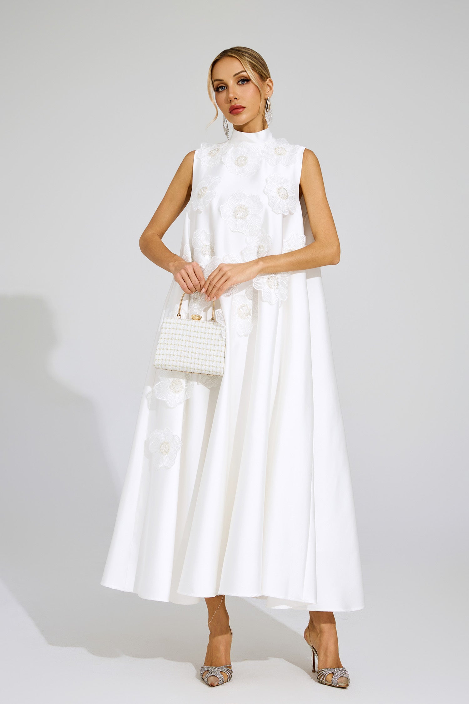 Design Details: This voluminous A-line dress features a high neckline and sleeveless silhouette, adorned with soft white floral appliqués along the front. The back is finished with an elegant oversized bow tie and a flowing cape-like structure, adding refined drama and sophistication to the silhouette. The floral details are lightly beaded at the center, catching light subtly.