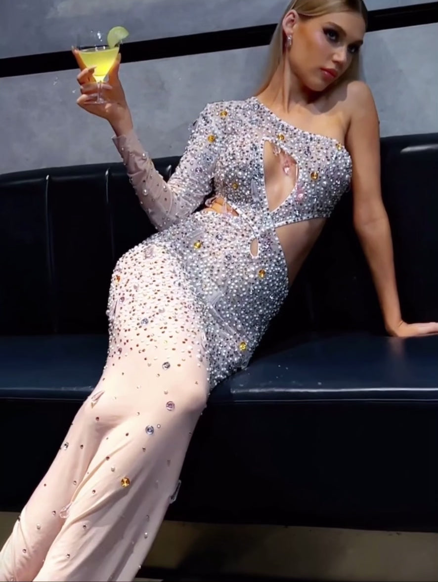 The Halle One Shoulder Cutout Emebellished Maxi Dress is perfect for special occasions. Its one shoulder style and cutout design showcases sophisticated elegance, while the emebellishments add a unique touch of luxury. Comfortable and stylish, this maxi dress is sure to make a lasting impression.