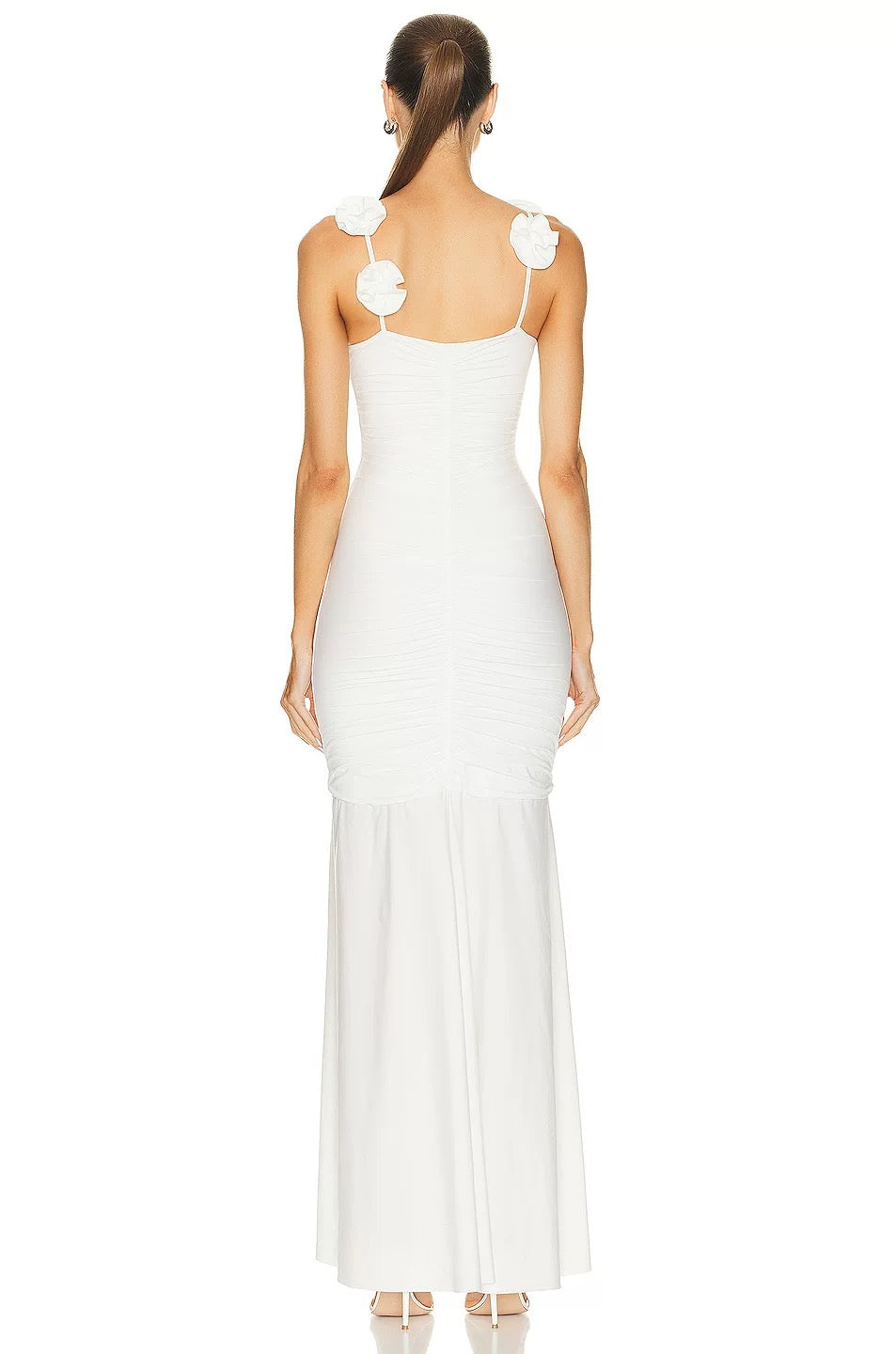 Design Details: Elegant and feminine, this floor-length gown features delicate 3D flower appliqués on each shoulder strap, creating a romantic touch. The dress is fully ruched for a flattering contour effect, and it includes a dramatic front slit for ease of movement and a graceful silhouette.