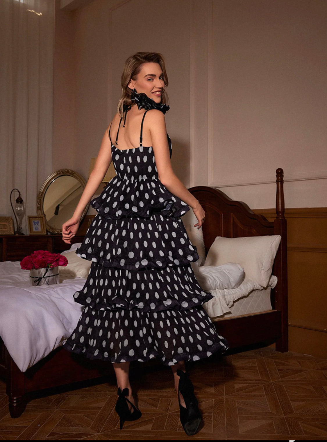 Experience effortless style with the Leila Spaghetti Dot Tiered Dress. Made from high-quality materials, this dress features a tiered design and delicate spaghetti straps. Perfect for any occasion, its stylish polka-dot pattern adds a touch of playful charm. Elevate your wardrobe with this must-have dress.