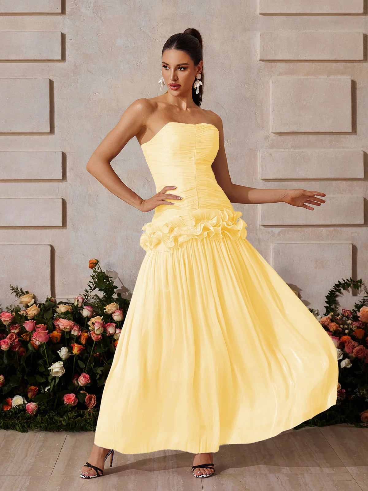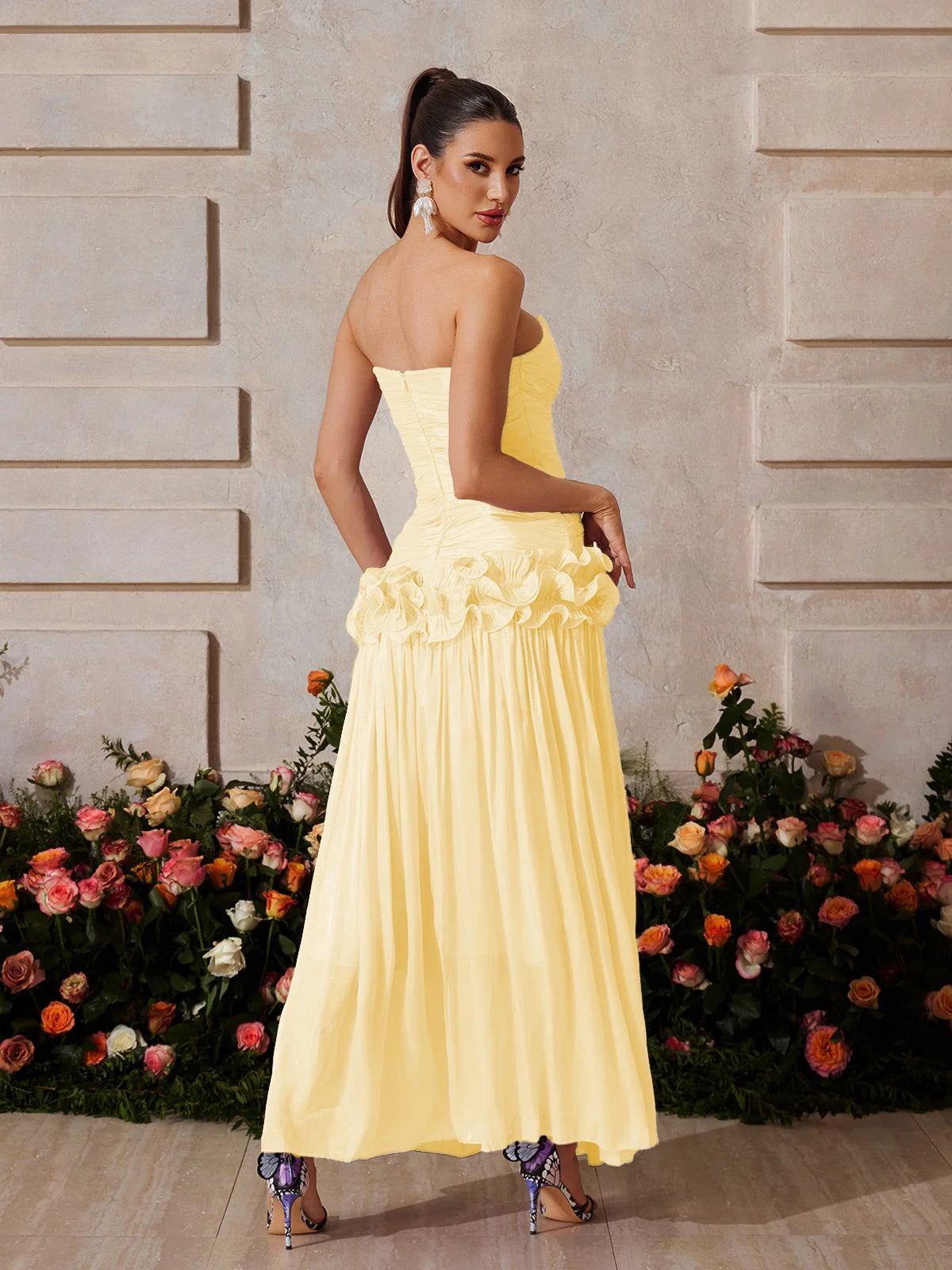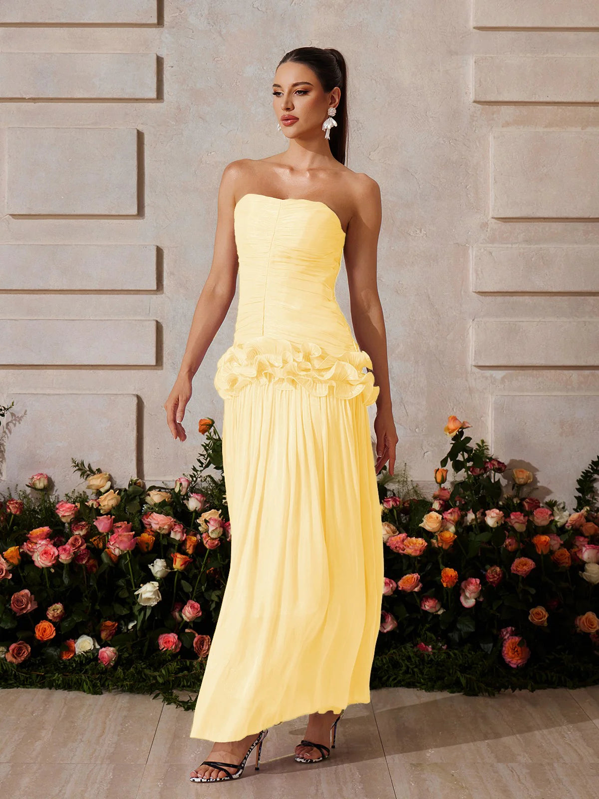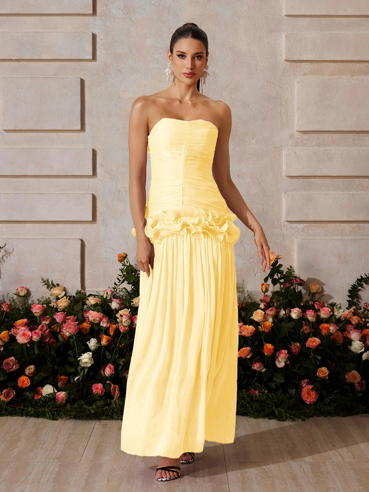 Design Details: This radiant strapless gown features a ruched bodice that sculpts the upper silhouette and highlights the neckline. A ruffled floral peplum at the hipline creates a feminine flair and transitions into a flowing, semi-sheer pleated skirt that catches the light beautifully. Zipper closure at the back.