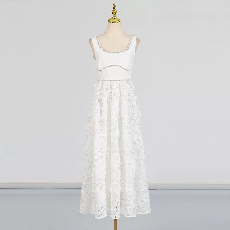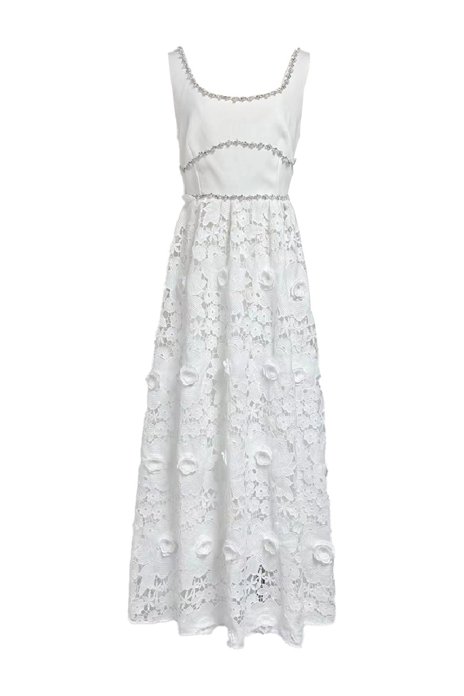 - Sleeveless, scoop-neck bodice with elegant rhinestone embellishment around the neckline and waist