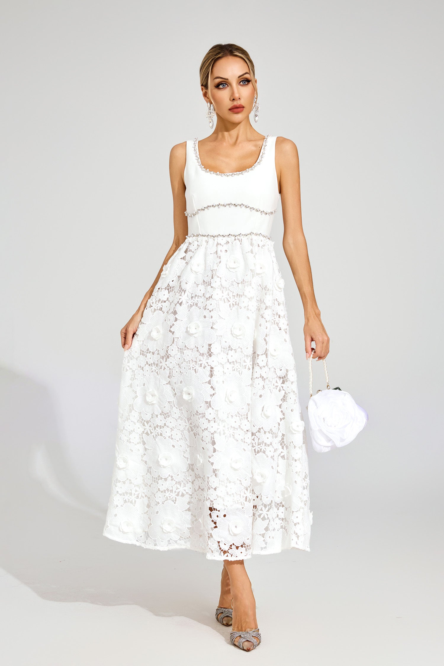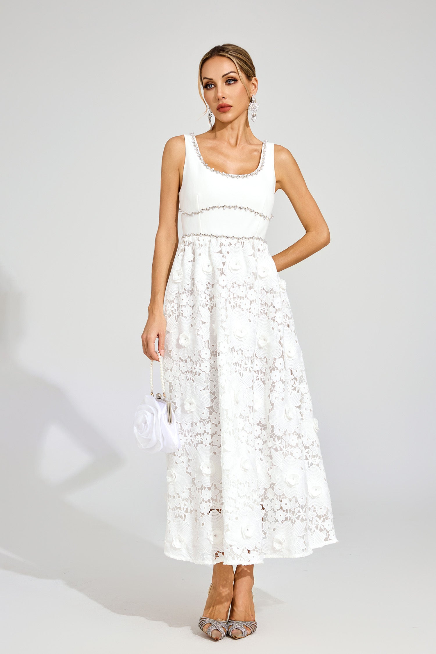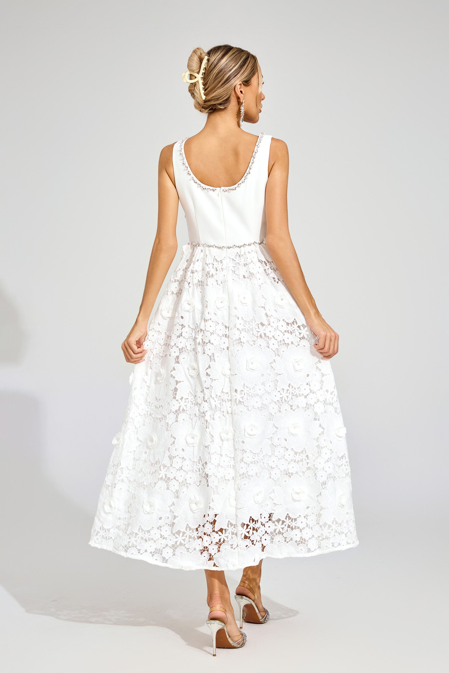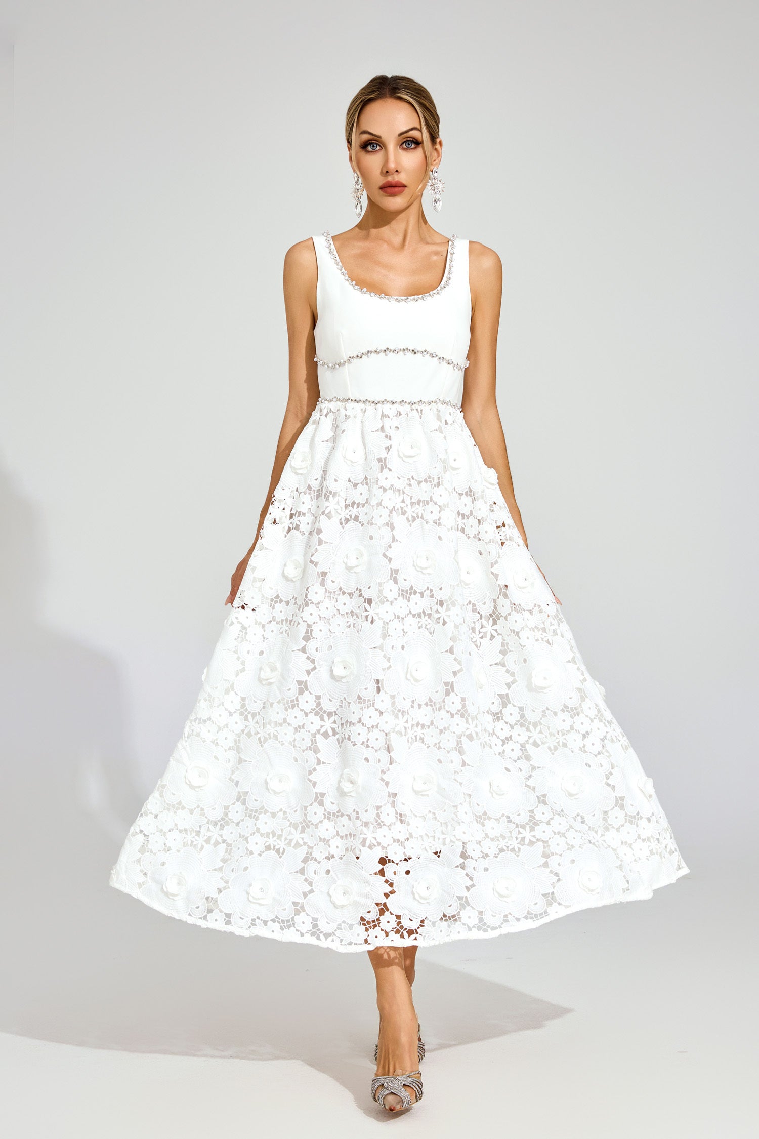 - Voluminous A-line midi skirt crafted from intricate floral lace with 3D appliqué flowers