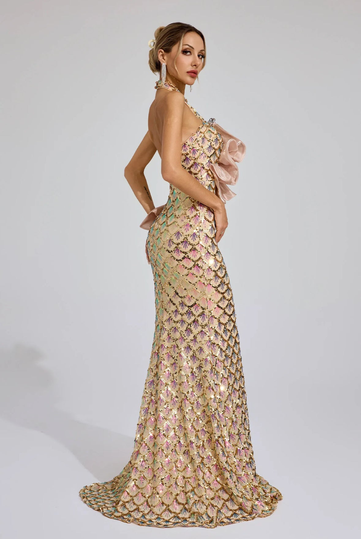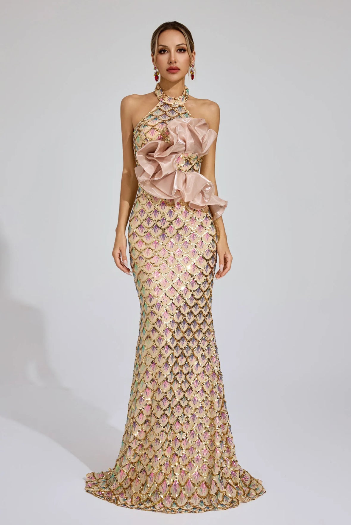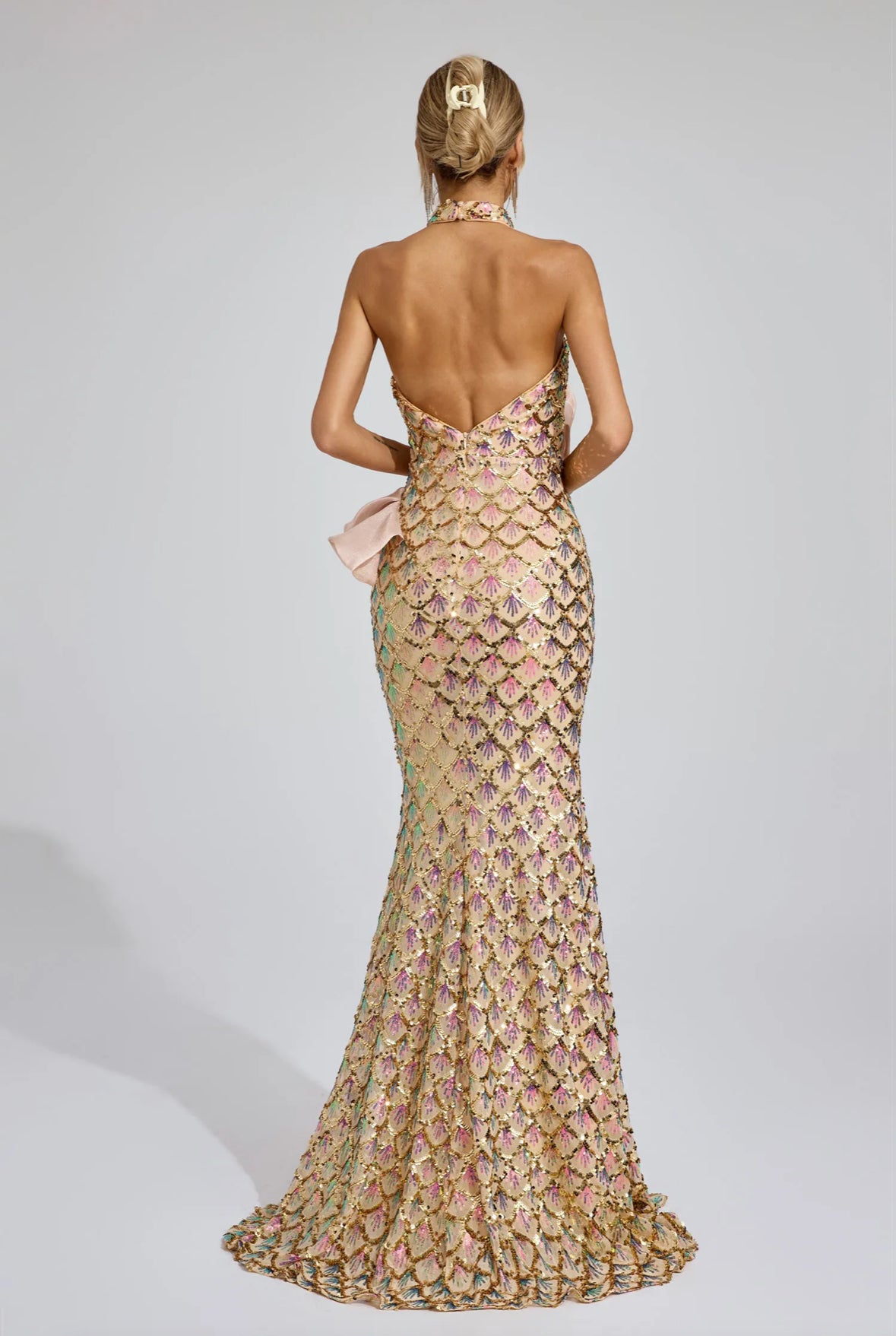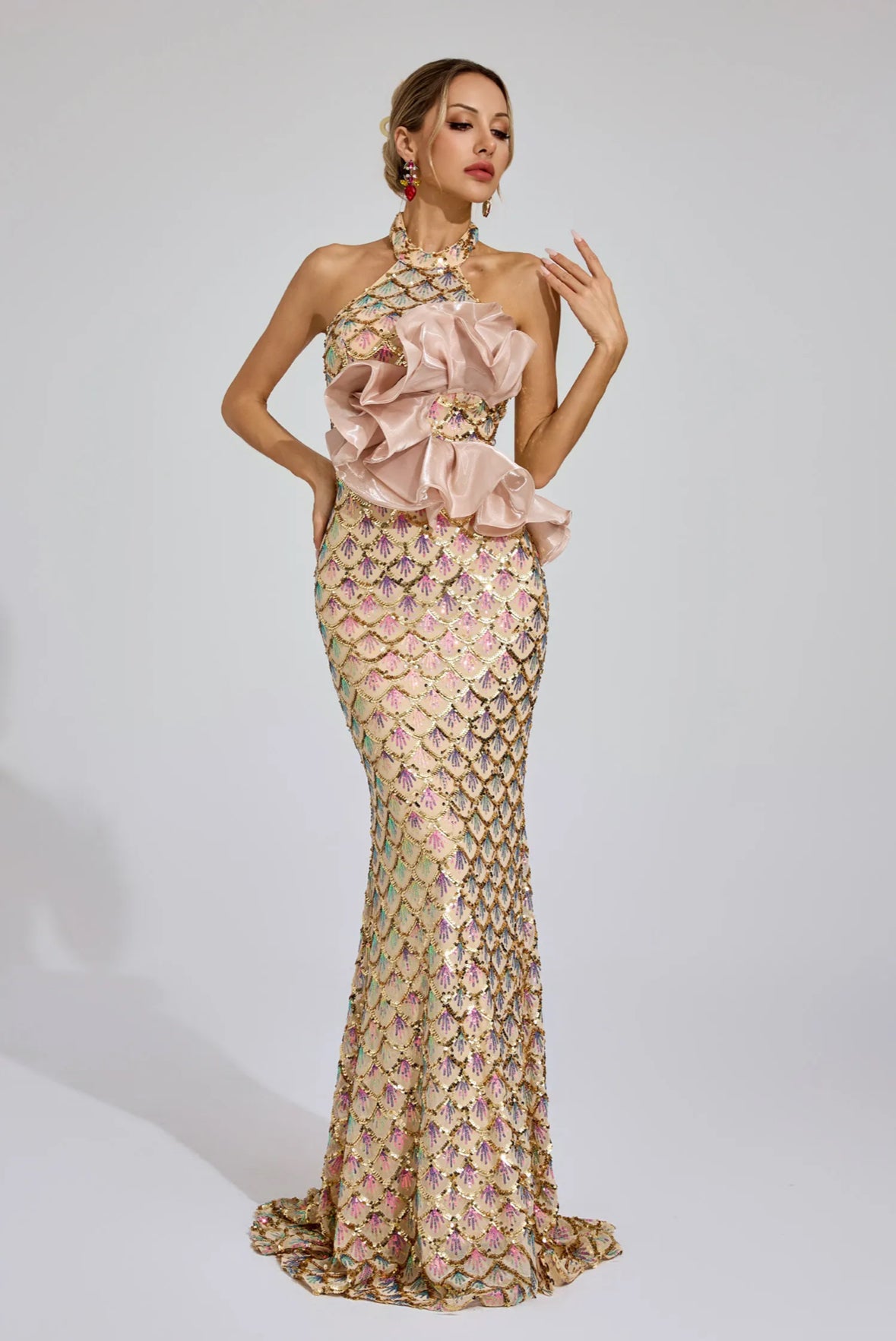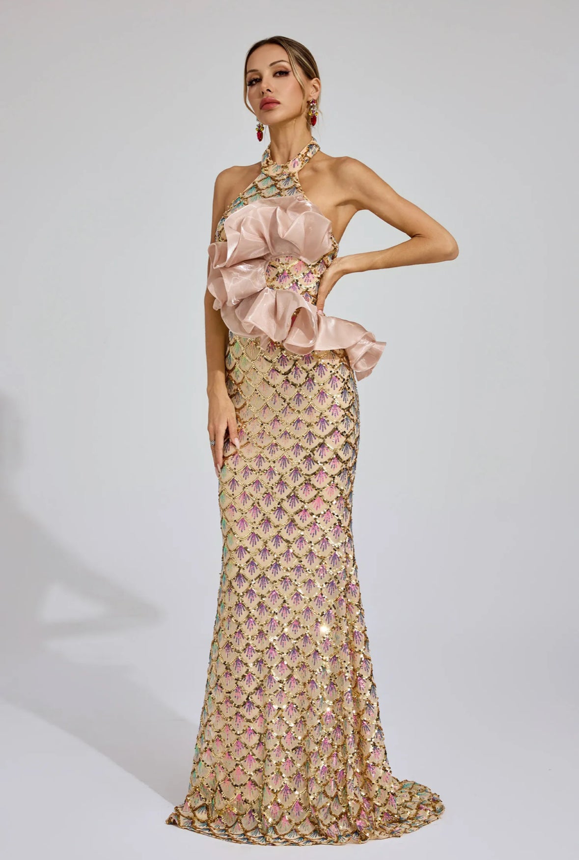 Design Details: A dazzling mermaid gown featuring iridescent embroidered scallops in pastel tones of pink, lavender, and aqua. The structured bodice boasts a halter neckline and a cascading blush satin ruffle at the waist for a dramatic touch. The gown sculpts the silhouette and flows into a graceful fishtail hem.